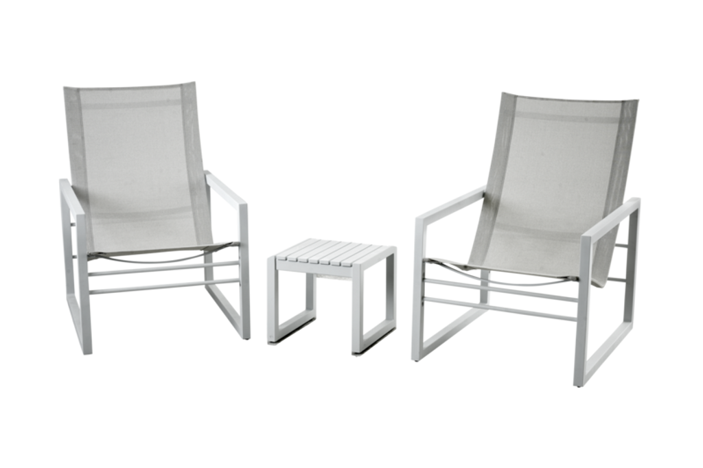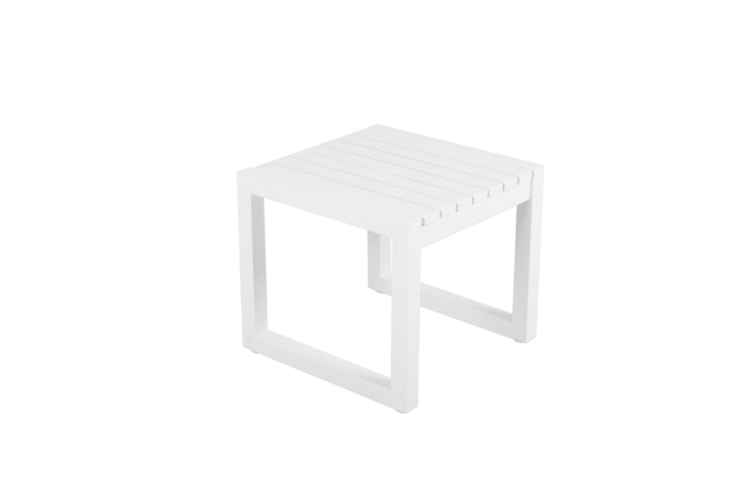 Stilrent sidobord i vitlackad aluminium, perfekt för utomhusmiljöer. Del av Brafabs Vevi-kollektion.