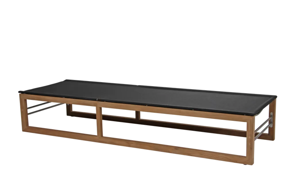 Elegant och modern vilsäng i obehandlad teak och svart textilene, perfekt för alla utemiljöer.