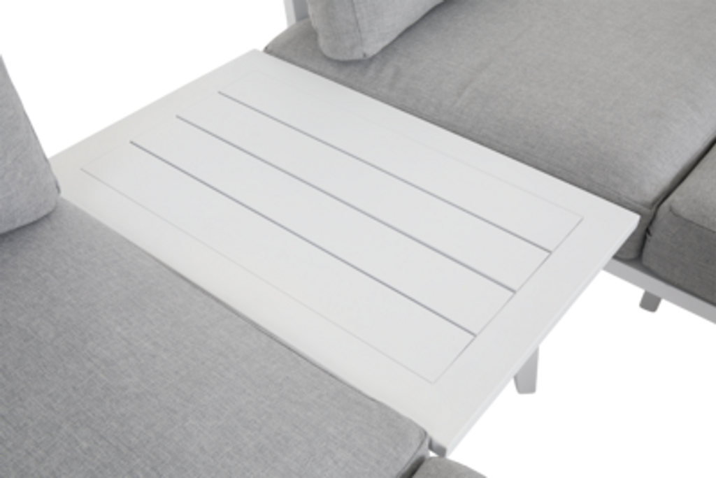 Elegant och modulärt soffbord i vit pulverlackerad aluminium, perfekt för flexibel utomhusinredning.