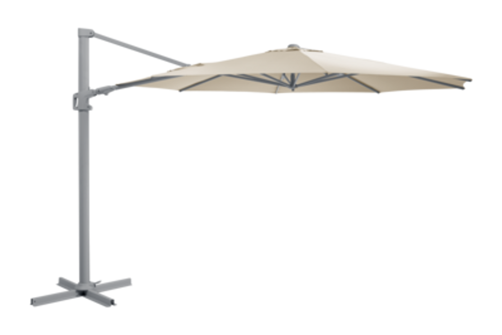 Det fristående aluminiumstativet är utrustat med en vev som gör det enkelt att öppna och stänga parasollet. Tack vare lutningsfunktionen och den steglösa justeringen kan du alltid hitta den perfekta skuggläget. Basen ingår, men för optimal stabilitet rekommenderas att den förankras med parasollfotsvikter.