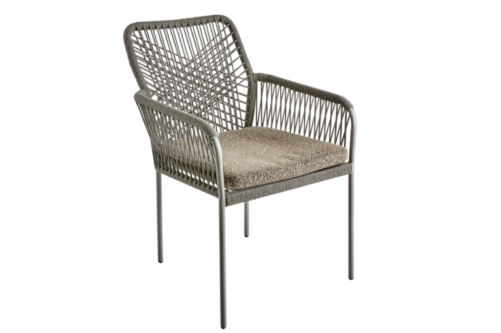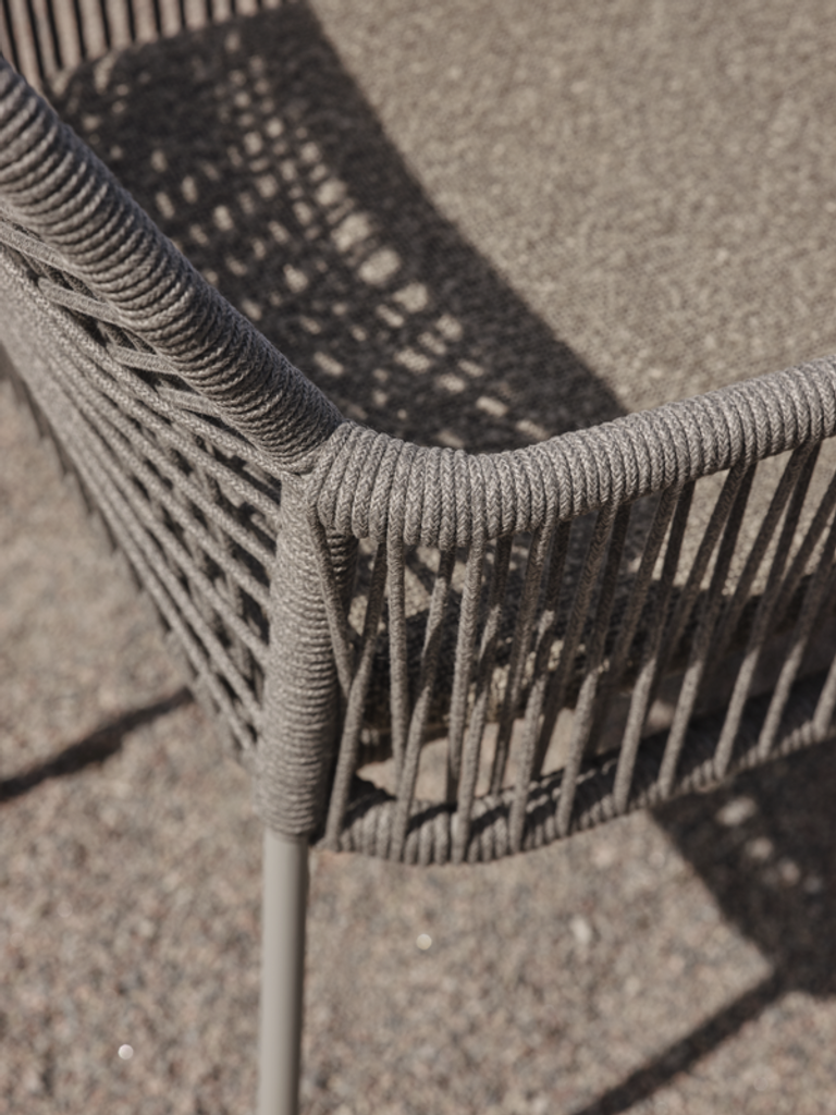 Elegant karmstol i väderbeständig design med flätade rep och robust stålram.