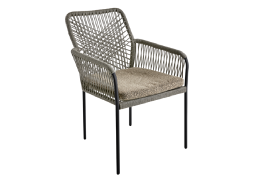 Det flätade mönstret på sitsen och ryggen ger en organisk och naturlig känsla, perfekt för att skapa en avkopplande atmosfär. De jordnära tonerna harmoniserar med naturen och bjuder in till både vila och samtal. För extra komfort ingår en mjuk sittdyna.