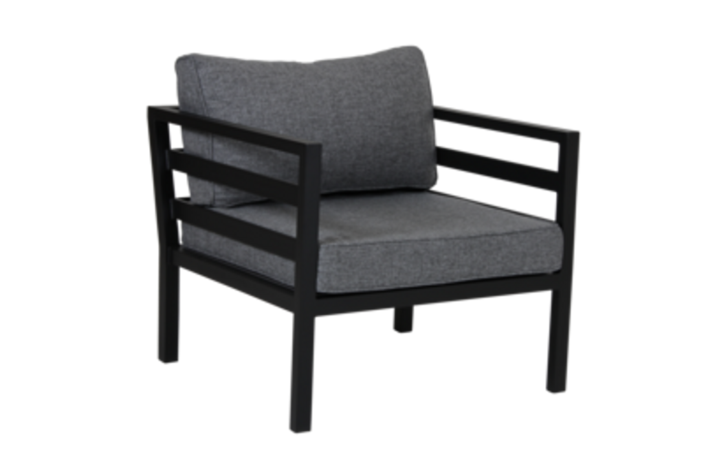 Elegant och hållbar fåtölj i pulverlackerad aluminium med vattentåliga dynor för optimal utomhuskomfort.