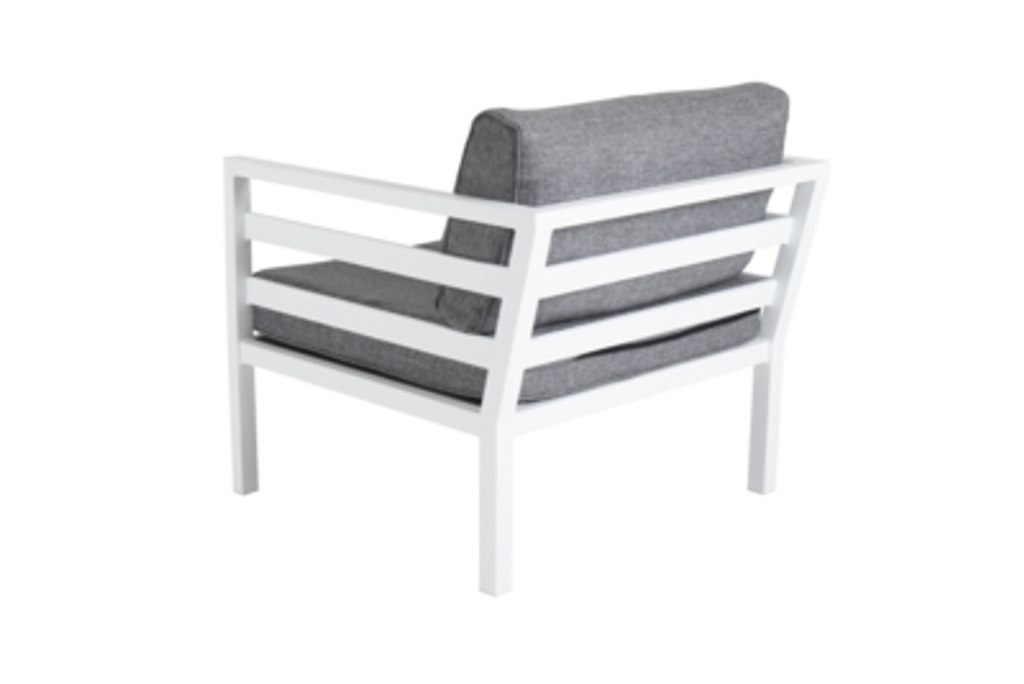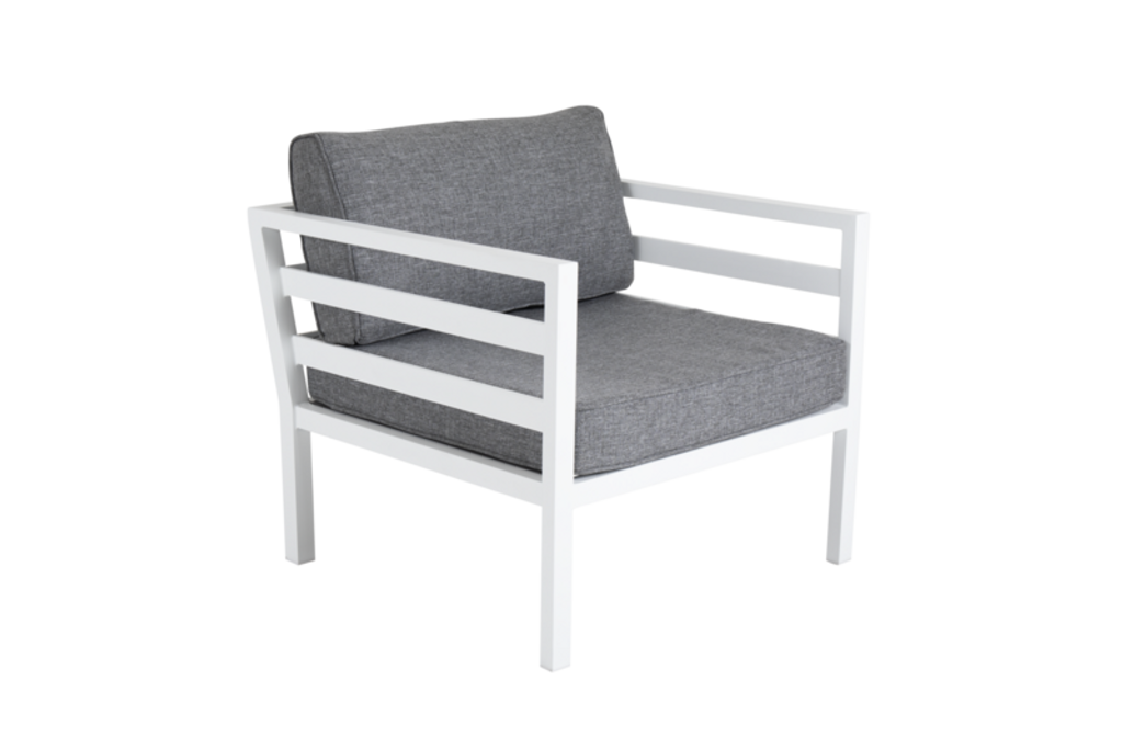 Elegant och hållbar fåtölj i vit pulverlackerad aluminium med vattentåliga grå dynor. Perfekt för utomhusbruk.