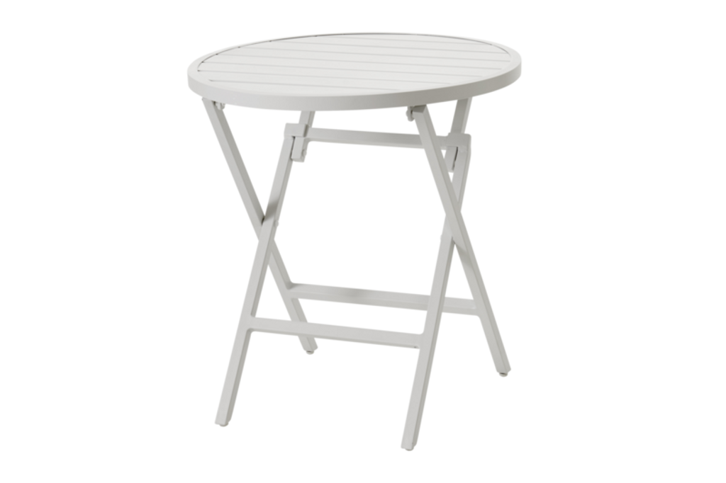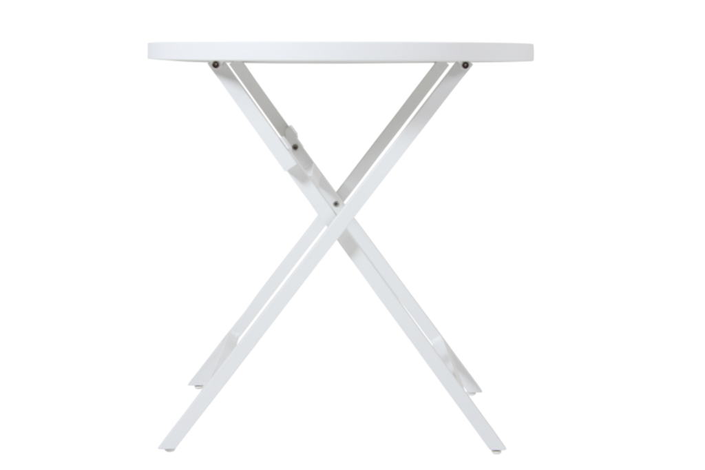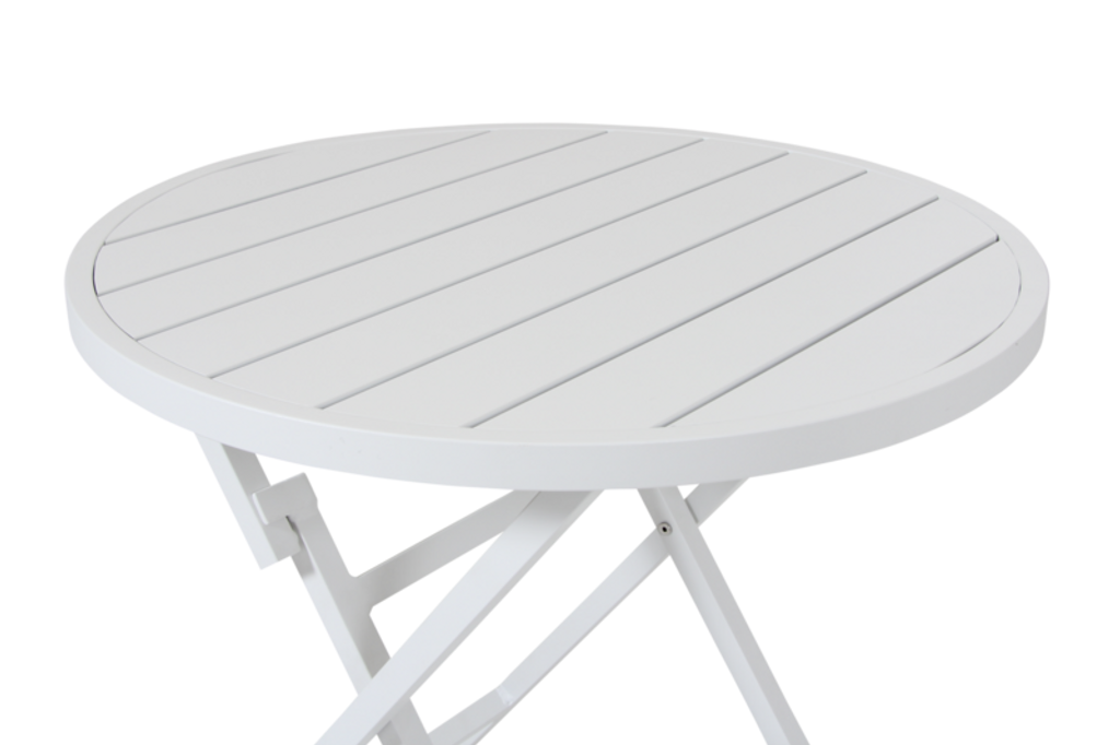 Kompakt och stilrent fällbord i vitlackerad aluminium från Brafab, perfekt för flexibel utomhusanvändning.