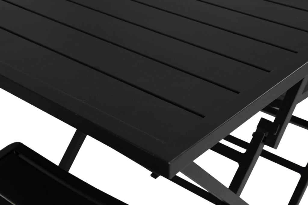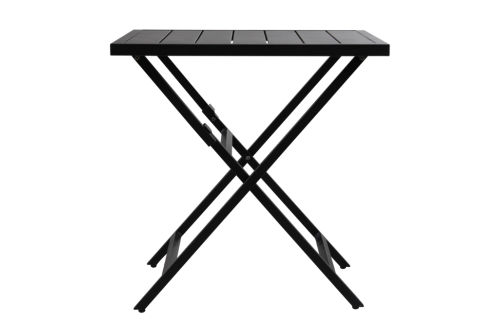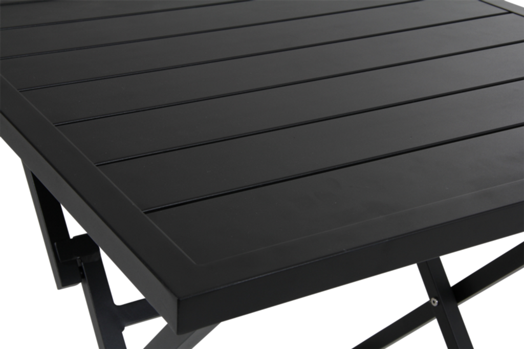 Praktiskt och stilrent fällbord i svart pulverlackerad aluminium, perfekt för flexibel utomhusanvändning.