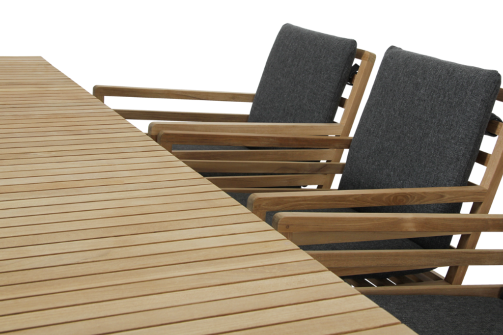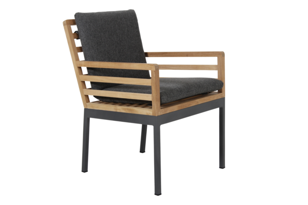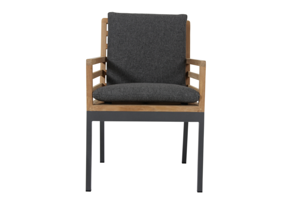 Elegant och stilren matstol med grå aluminiumram och teakdetaljer. Perfekt för utomhusbruk.