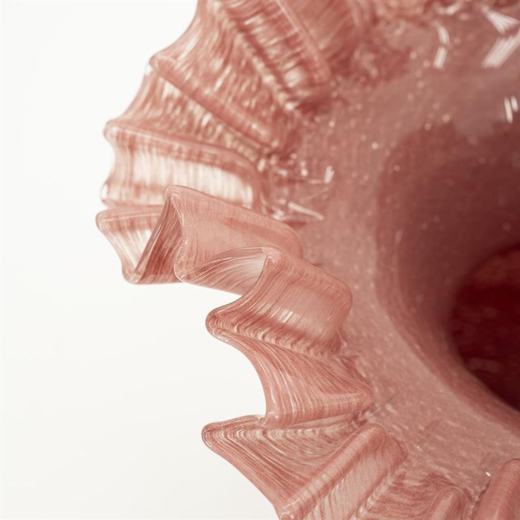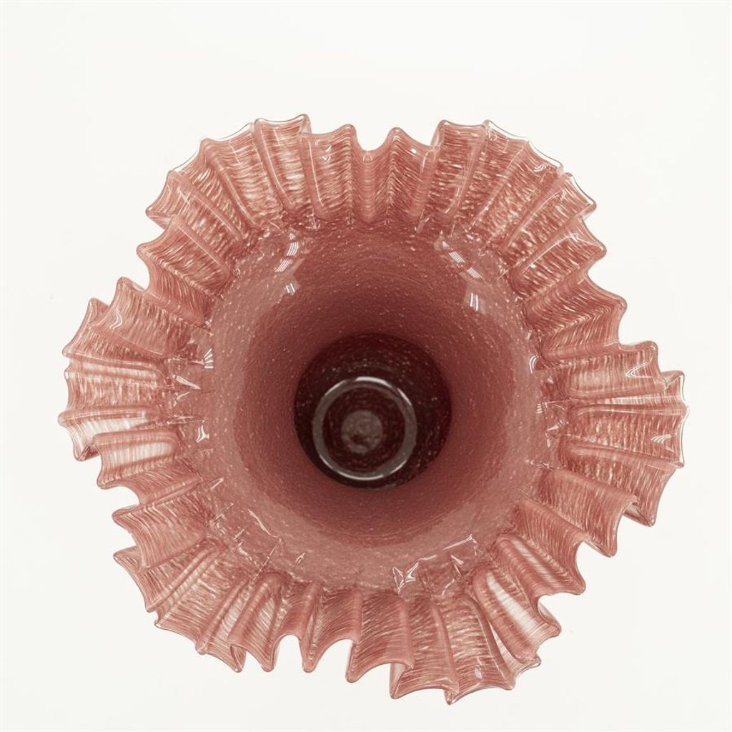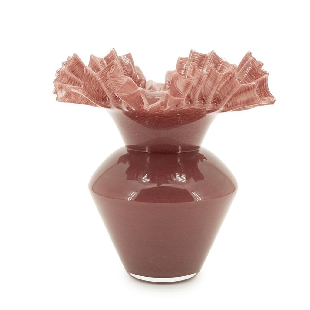 Elegant glasvas i burgundy röd med unikt veckad kantdesign, perfekt för att lyfta din inredning.
