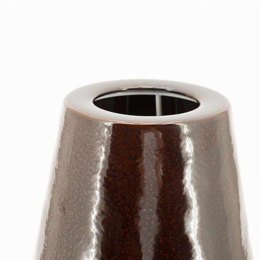 Denna vas kännetecknas av sin unika glansiga yta, vilket ger en modern och sofistikerad känsla. Den bruna färgen bidrar med en varm ton som enkelt smälter in i olika inredningsstilar.