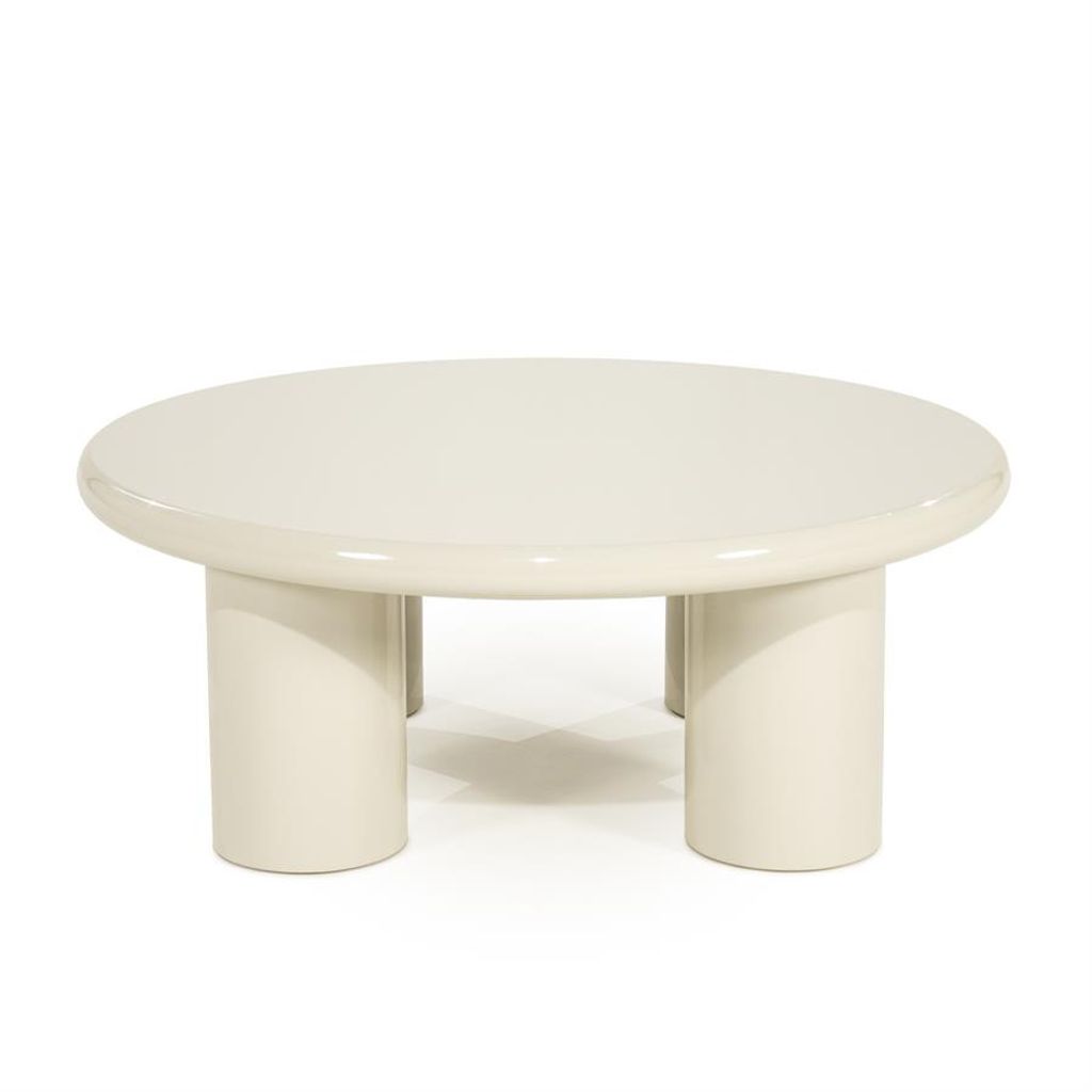 Den runda formen och de släta ytorna ger bordet ett modernt och stilrent utseende, medan de breda cylindriska benen ger stabilitet och hållbarhet. Detta soffbord är den perfekta kombinationen av funktion och design, och kommer utan tvekan att bli en central punkt i ditt hem.