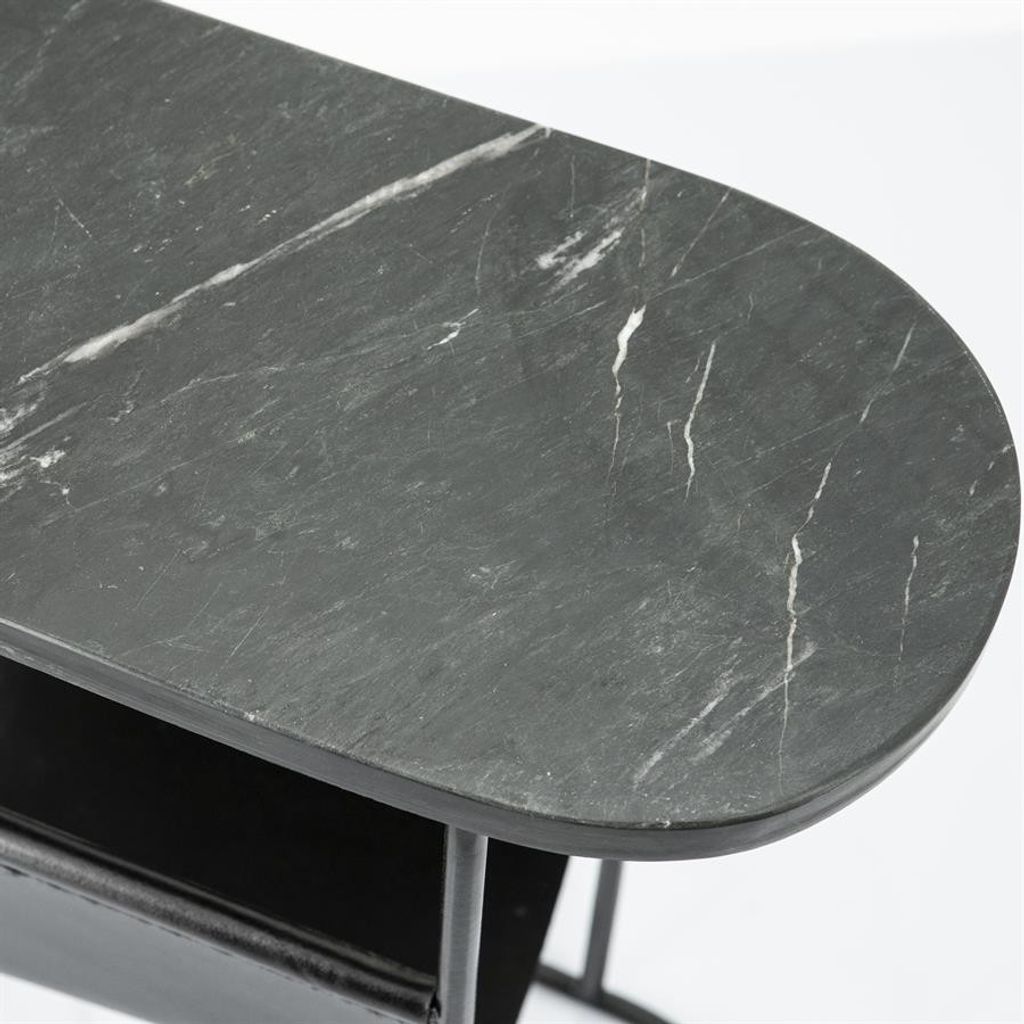 Elegant svart sidobord med marmor och läder, perfekt för moderna hem.