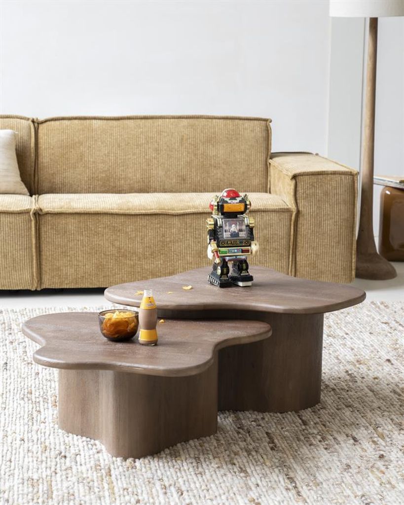 Elegant soffbord i mangoträ, perfekt för moderna hem. Finns i två storlekar med mjuka former och en varm brun finish.