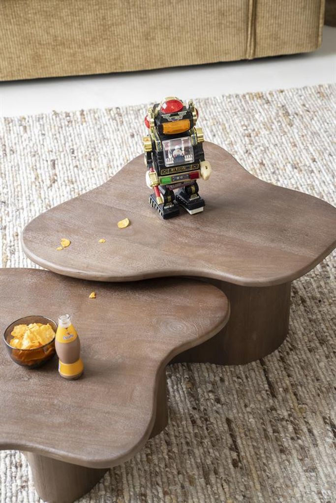 Bordet finns i två storlekar: 75x75x38 cm och 75x65x32 cm, vilket ger flexibilitet för olika utrymmen. Dess unika, mjuka former skapar en harmonisk och stilren atmosfär. Varje bord har en slät yta som är lätt att rengöra, samtidigt som den robusta konstruktionen garanterar stabilitet.