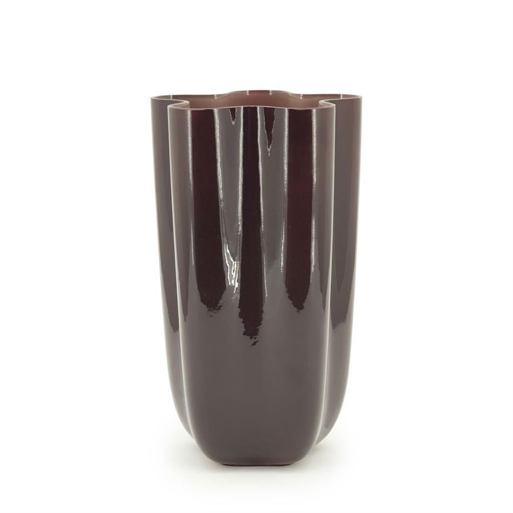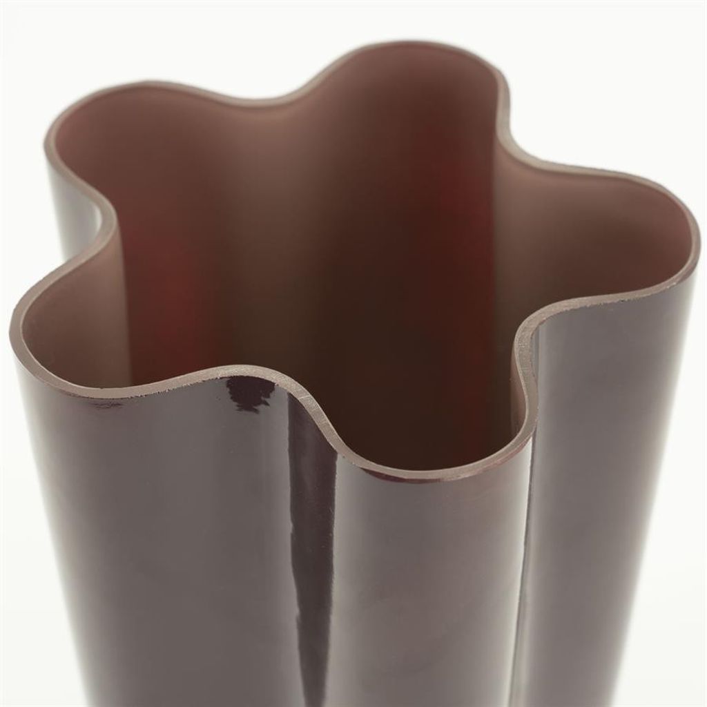 By Boo Flori lila glasvas är ett elegant tillskott till ditt hem. Tillverkad av högkvalitativt glas och med en djup lila färg, skapar denna vas ett sofistikerat intryck i vilket rum som helst. Vasen har en unik form med mjuka vågiga kanter som ger ett modernt och stilrent utseende. Den är perfekt för att framhäva dina favoritblomsterarrangemang, oavsett om det är på matbordet eller i vardagsrummet. Med måtten 17,5x17,5x30 cm är den en idealisk storlek för att vara ett centralt blickfång.