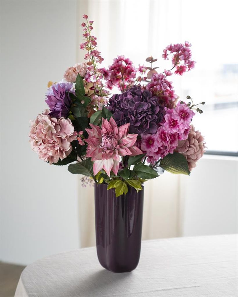 Den glansiga ytan reflekterar ljus vackert, vilket framhäver den lila nyansen och ger en lyxig känsla. Placera den i naturligt ljus för att se dess fulla skönhet. By Boo Flori lila glasvas är ett utmärkt val för dig som uppskattar stil och kvalitet i dina inredningsdetaljer.