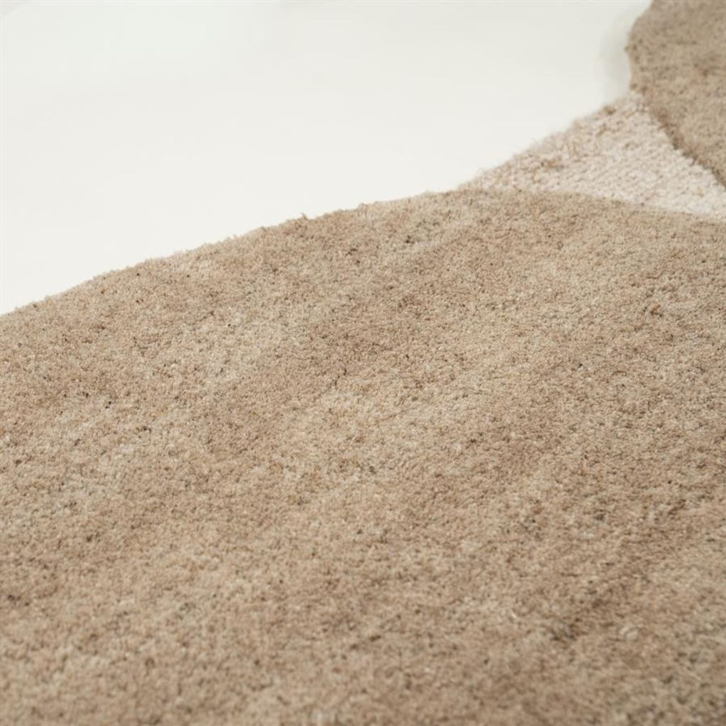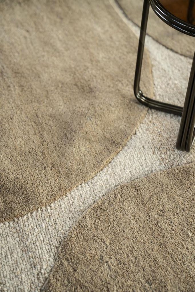 Elegant matta i polyester och ull med organisk design och jordnära bruna toner. Perfekt för modernt hem.