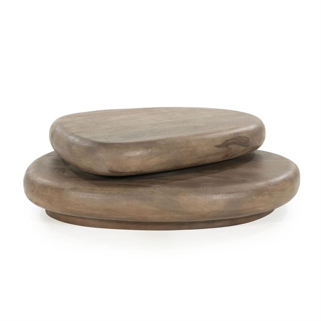Elegant soffbord i mangoträ, två nivåer, perfekt för moderna och stilrena hem.