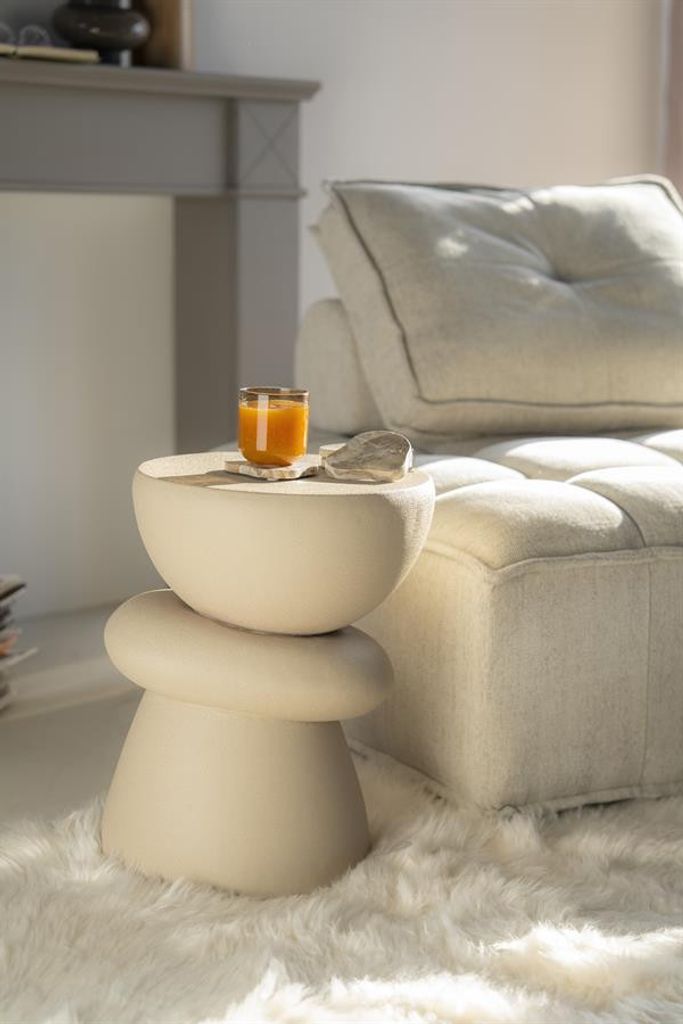 Den unika formen med böljande linjer ger bordet en konstnärlig känsla, medan den subtila beige färgen smälter in harmoniskt i olika inredningsstilar. Bordets storlek på 35x35x47 cm gör det idealiskt som en dekorativ yta för drycker, böcker eller prydnadsföremål.