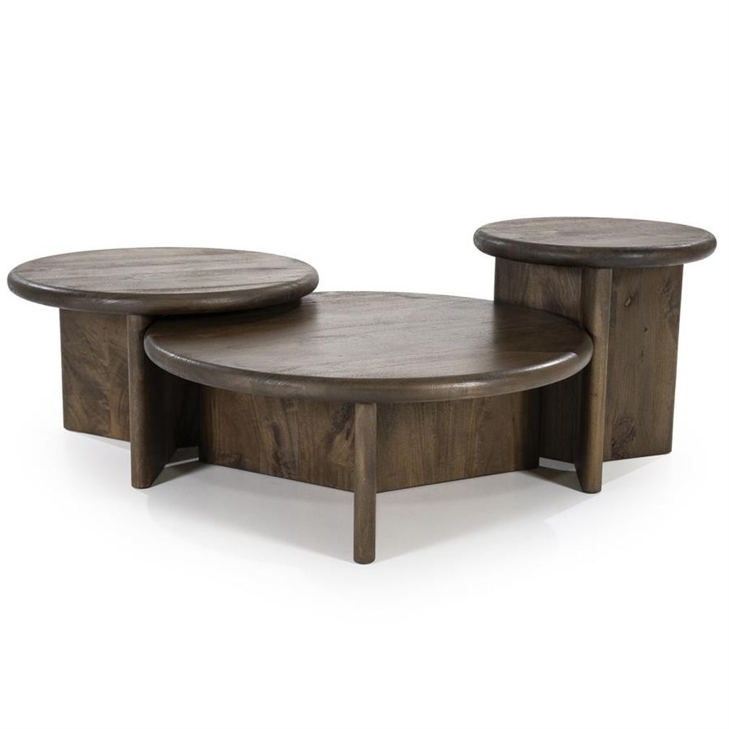 Med en kompakt storlek på 45x45x45 cm passar den perfekt som ett sidobord bredvid soffan eller som ett elegant nattduksbord. Den runda toppen och mjuka kanterna ger bordet ett inbjudande och mjukt utseende, medan den bruna finishen framhäver träets naturliga skönhet och variationer, vilket ger varje bord en unik karaktär.
