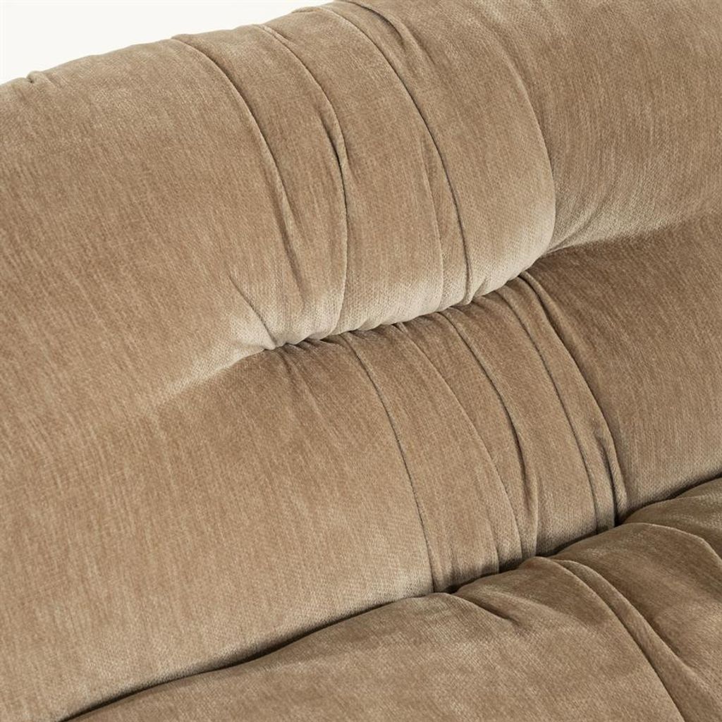 Den släta och mjuka texturen av klädseln ger en lyxig känsla, medan de djupa kuddarna säkerställer maximal komfort under långa stunder av avkoppling. Dess subtilt rundade form och eleganta veck ger fåtöljen en modern touch, vilket gör den till en utmärkt match för olika inredningsstilar.