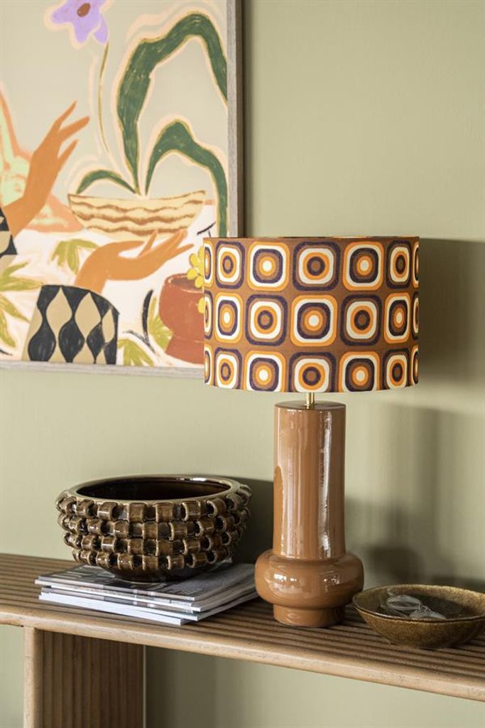 Förnya ditt hem med den eleganta By Boo Orbit Bordslampa i brun färg. Denna lampa kombinerar modern design med retrostil, vilket framhävs av den distinkta mönstrade lampskärmen i varma bruna toner. Skärmens geometriska mönster ger en unik touch och skapar en visuell intressant effekt när lampan är tänd.
