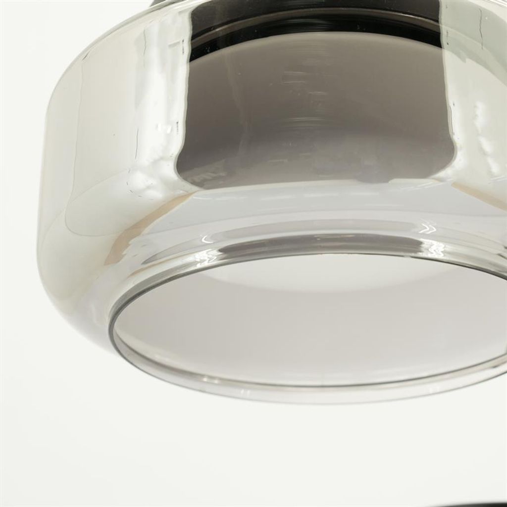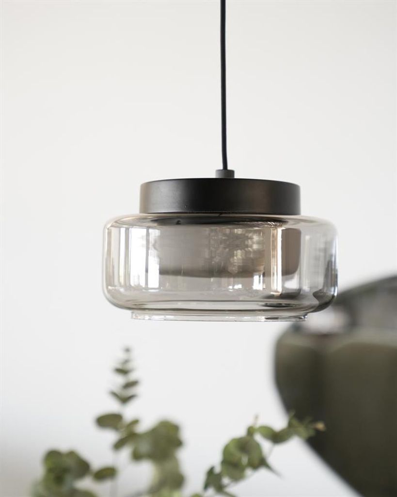 Elegant grå taklampa i järn och glas med modern design. Perfekt för stilfulla hem.