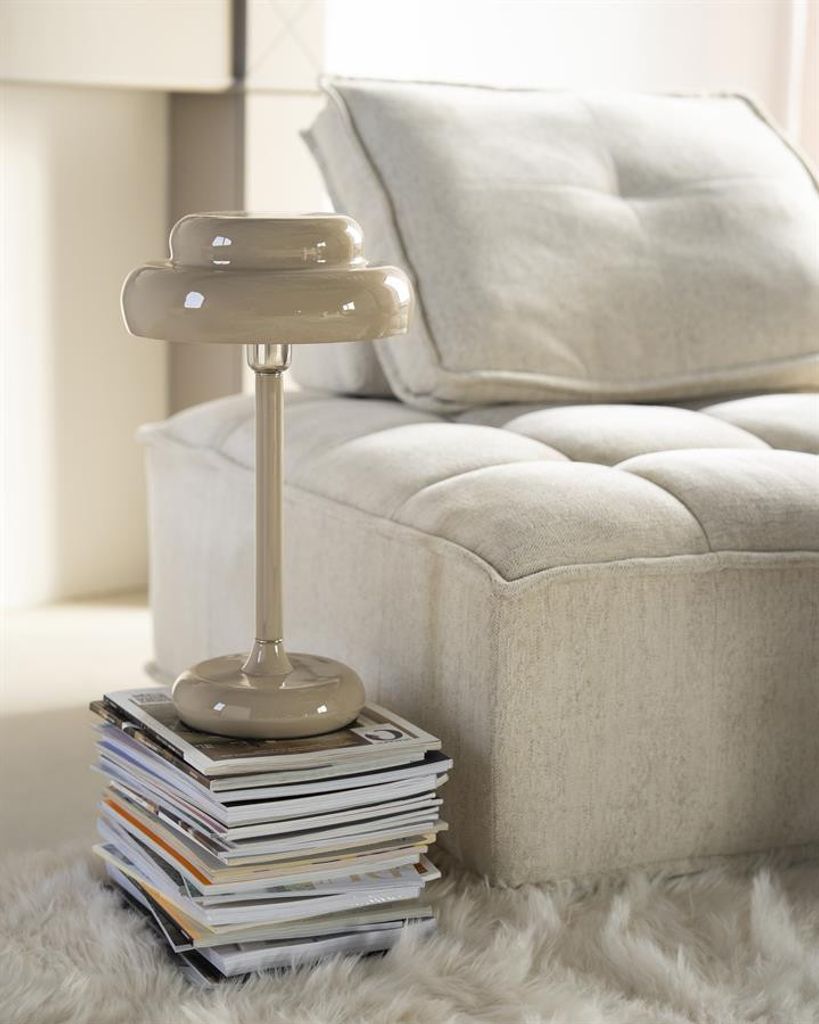 Elegant beige bordslampa i järn med unik design. Perfekt för att addera stil och funktion till ditt hem.