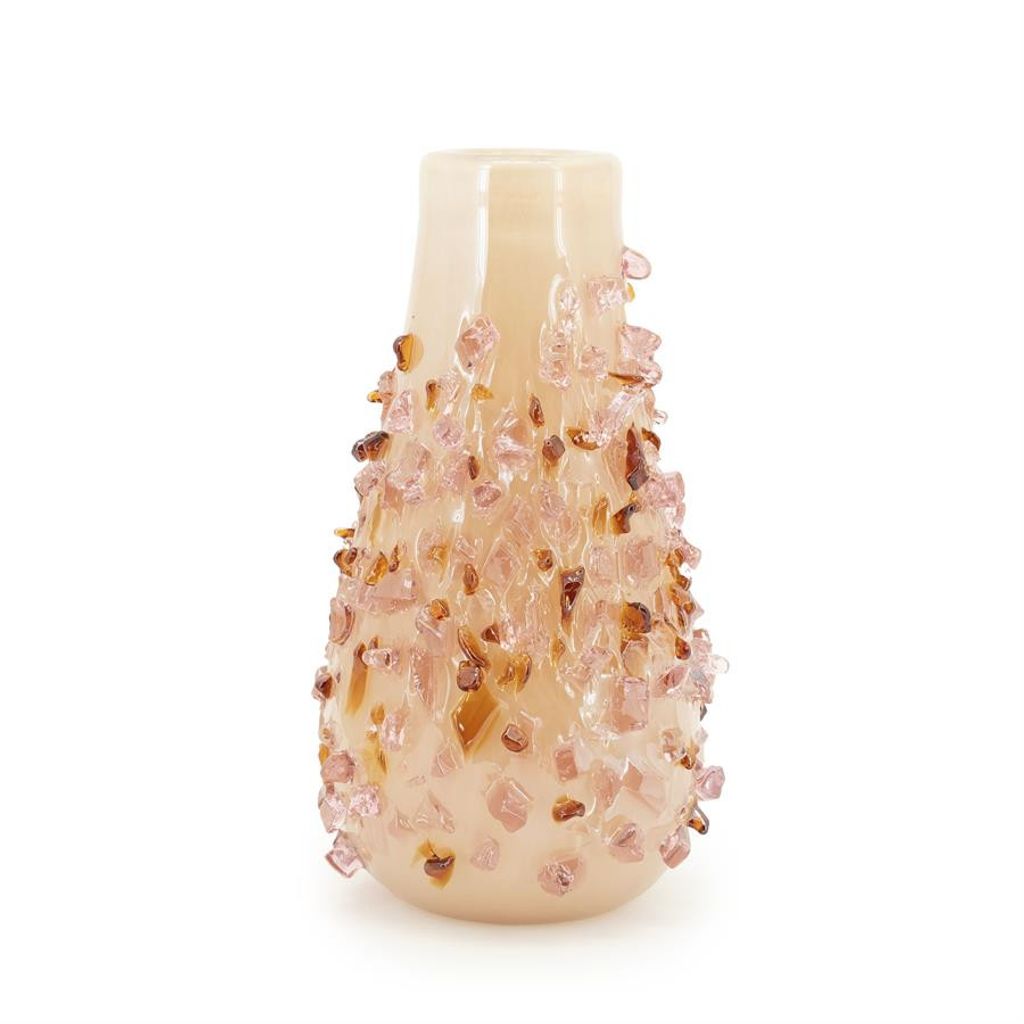 Vasens strukturerade design erbjuder en fascinerande visuell upplevelse, där de inkorporerade stenarna skapar ett spel av ljus och skugga. Det orange glaset ger en varm och inbjudande känsla, oavsett om den används för att visa upp blommor eller som en fristående dekorativ pjäs.