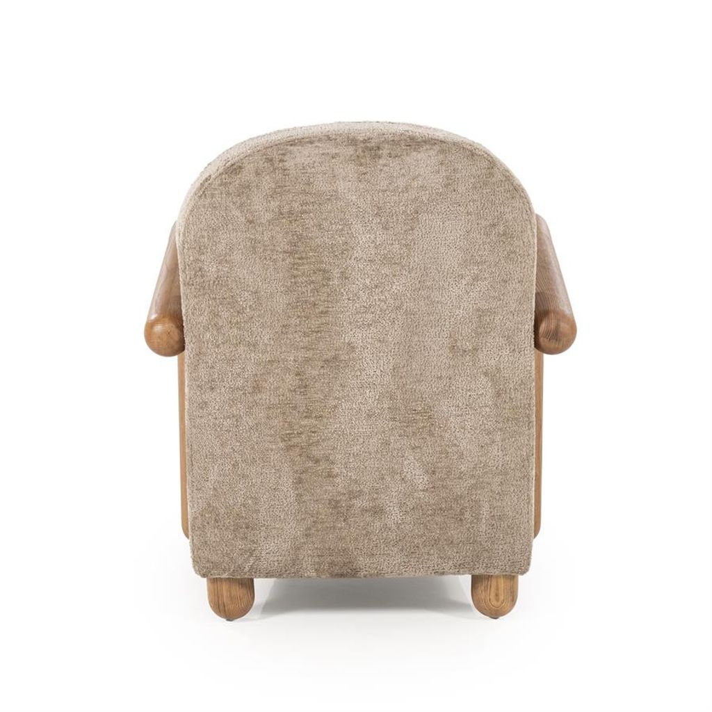 Fåtöljen har en stabil ram tillverkad av högkvalitativt essenträ, vilket ger en naturlig och varm känsla. De rundade armstöden bidrar till dess retroinspirerade design och erbjuder ett bekvämt stöd för armarna. Det mjuka tyget i varm mullvadsfärg är inte bara estetiskt tilltalande utan också slitstarkt och lättskött.