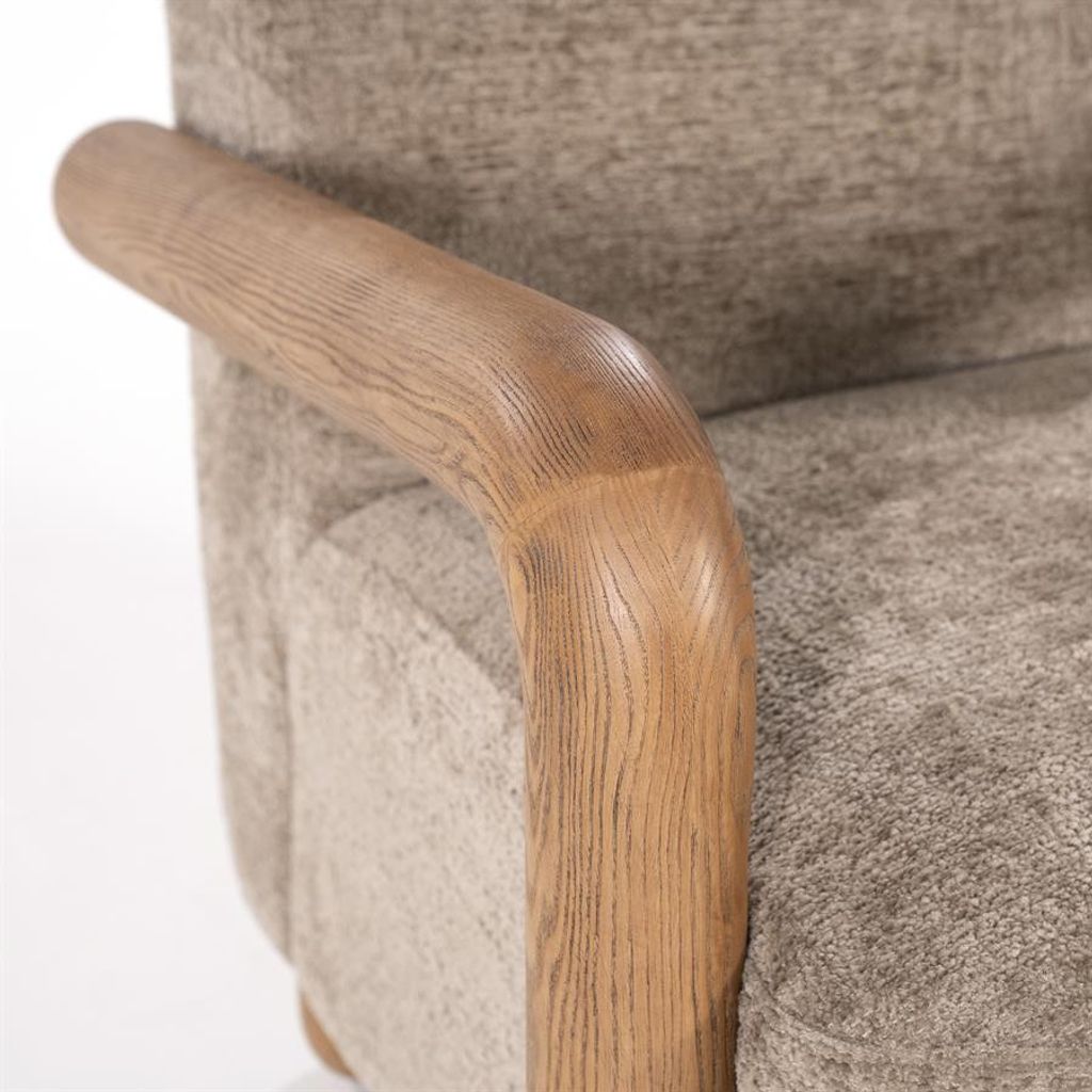 Elegant och bekväm fåtölj i mullvadsfärgat tyg med gedigna armstöd i essenträ. Perfekt för stilfull avkoppling.
