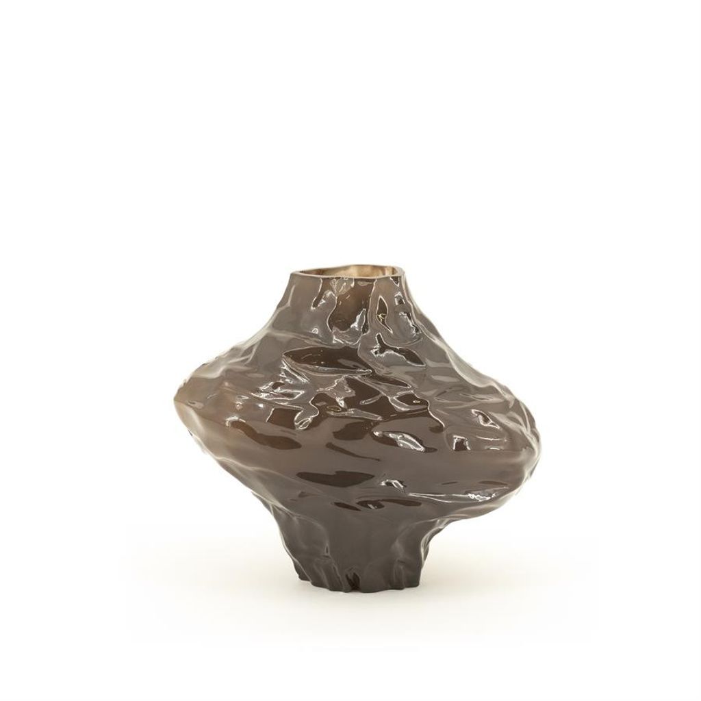 By Boo Rias Small är en unik glasvas i en elegant brun nyans. Med sina mått på 26,5x17x22 cm erbjuder denna vas en skulptural design som drar till sig blickar. Det bruna glaset har en subtil glans och texturen på ytan ger en känsla av rörelse och dynamik. Den harmoniserar perfekt med både moderna och klassiska inredningsstilar.