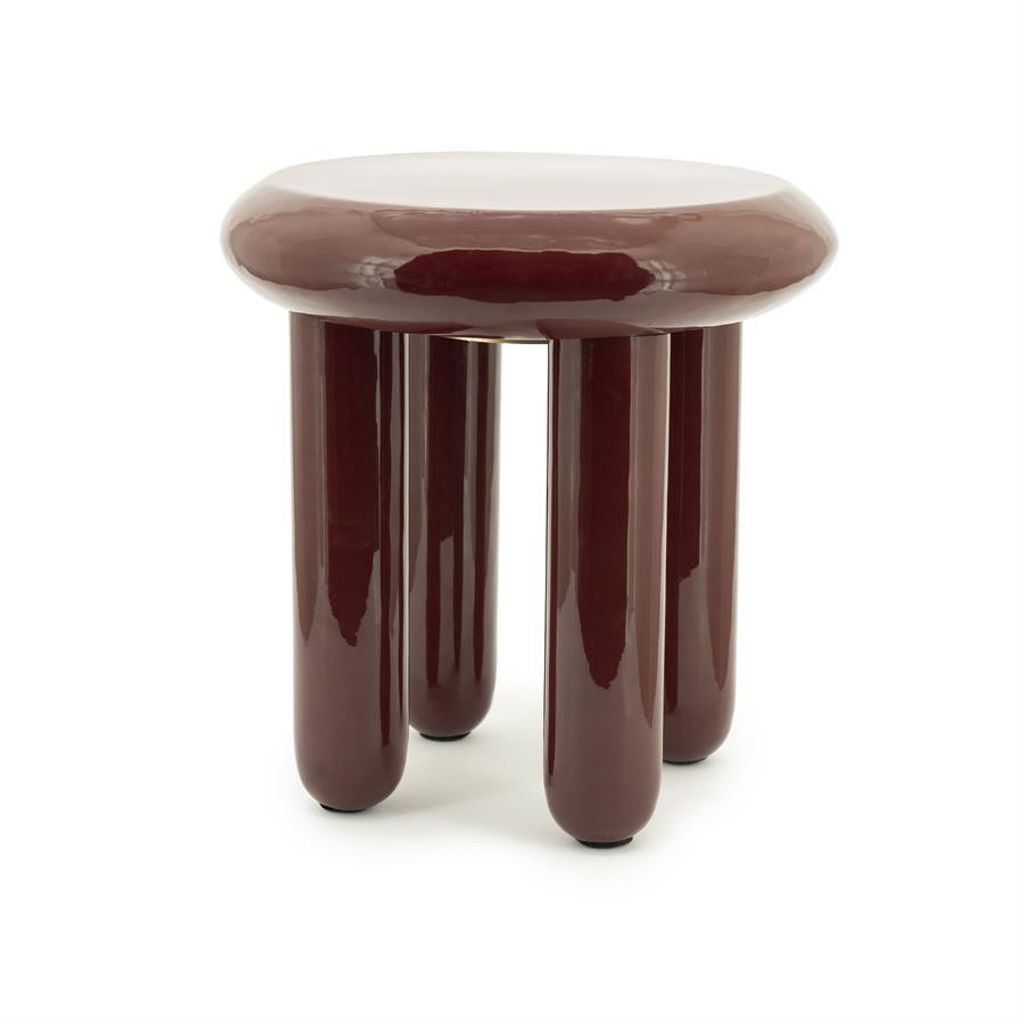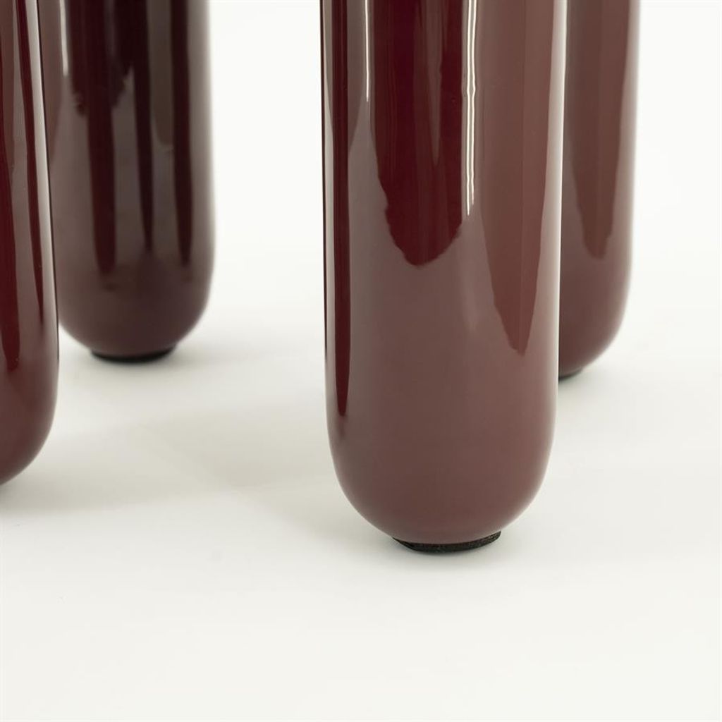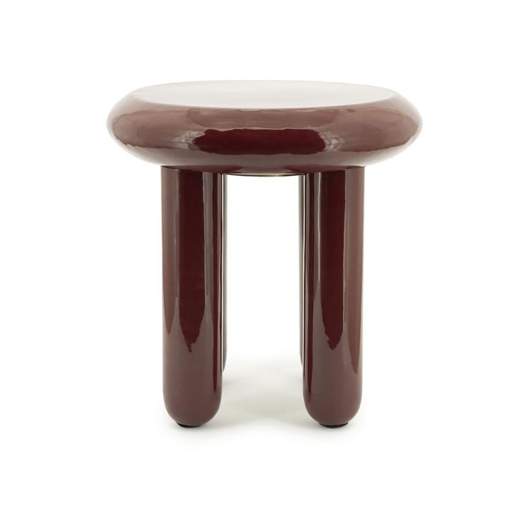 Den släta, glänsande ytan reflekterar ljuset vackert och de tre robusta benen ger stabilitet och en unik designkänsla. Den burgundyröda färgen tillför en djup och elegant ton till din inredning, vilket syns i produktbilderna där bordet harmoniserar med andra dekorativa element.