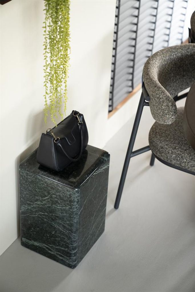 Detta By Boo Sidobord Dice är en elegant möbel tillverkad av högkvalitativ grön marmor. Dess kompakta storlek på 30x30x47 cm gör det till en mångsidig del i alla rum. Bordet har en slät, polerad yta med naturliga marmoreringar som ger varje stycke en unik look.