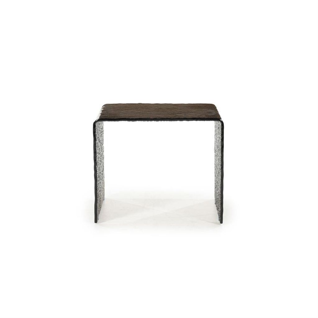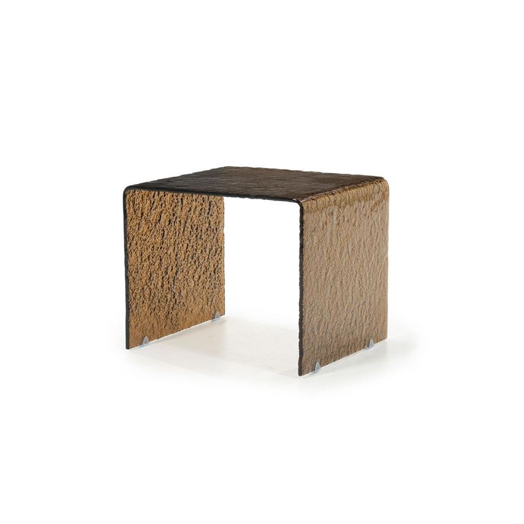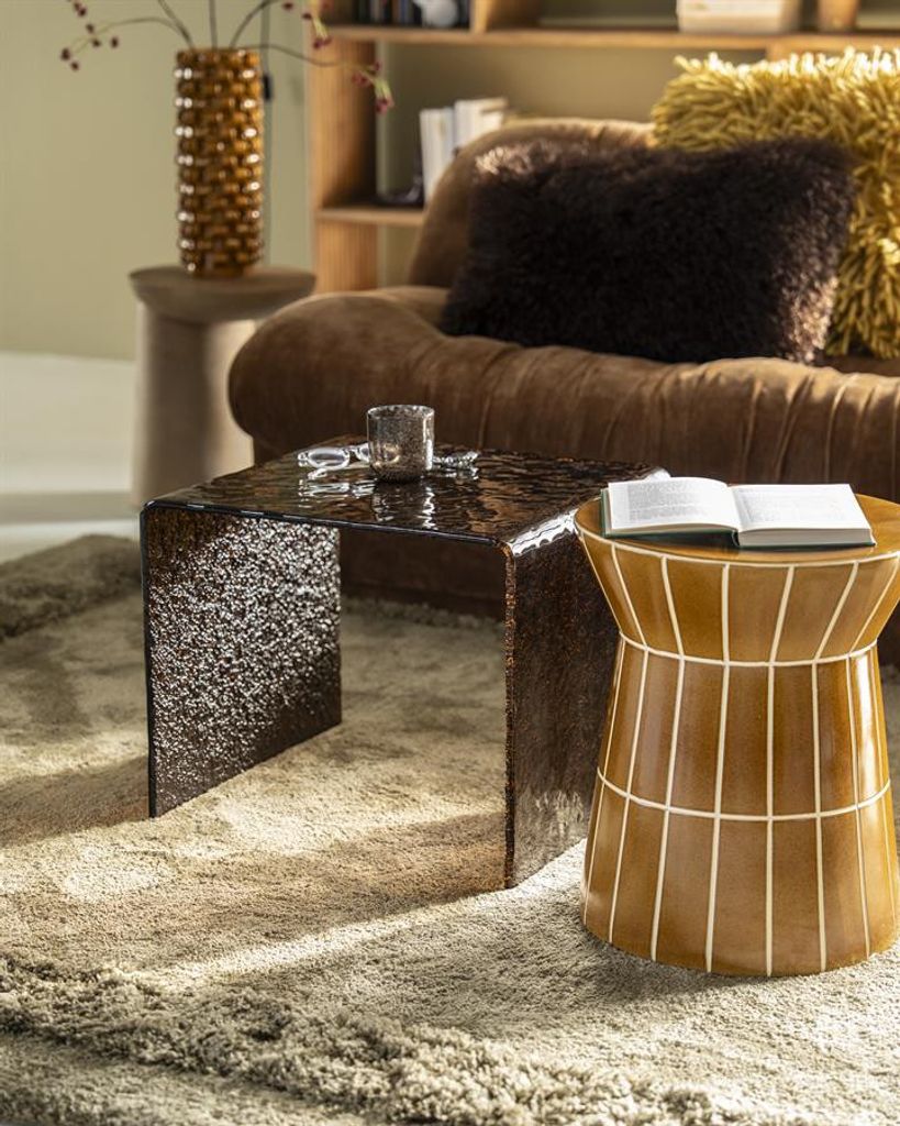 Elegant sidobord i brunt glas med unik vågstruktur. Perfekt för modern inredning.
