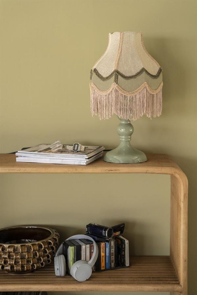 Elegant bordslampa i grönt med fransar och vintage-design. Perfekt för att skapa en mysig atmosfär.