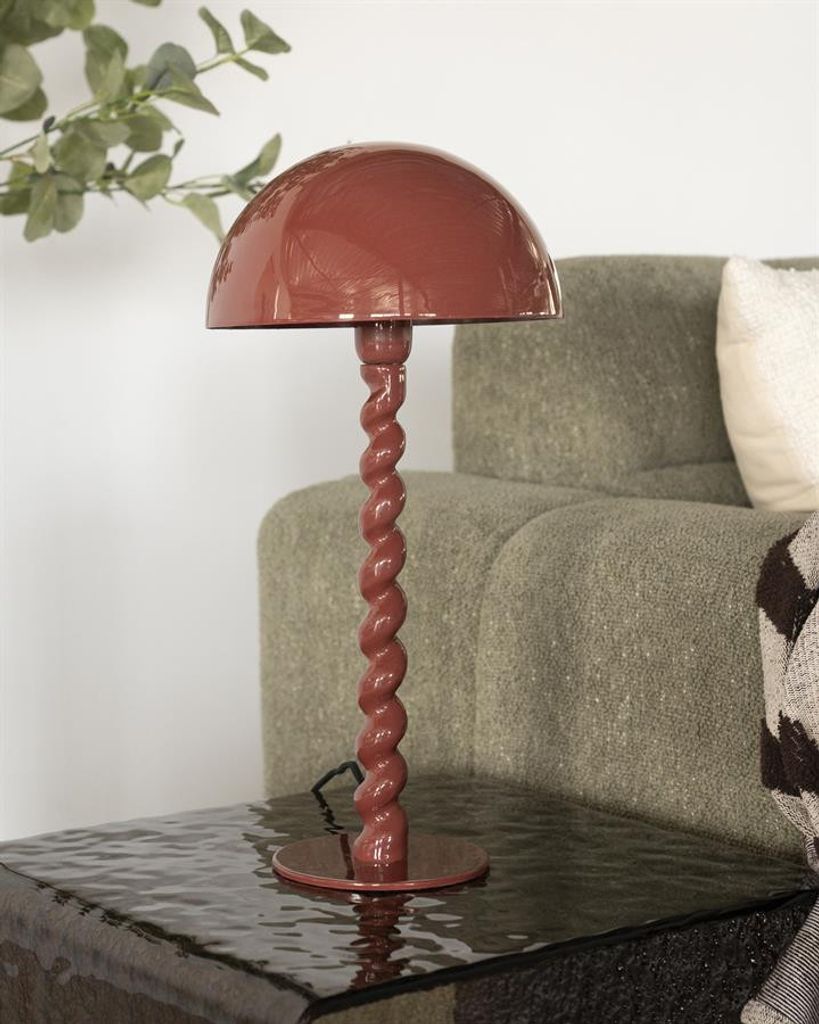 Elegant bordslampa i korallröd färg med unik tvinnad design. Tillverkad av mango trä och metall för modern stil.