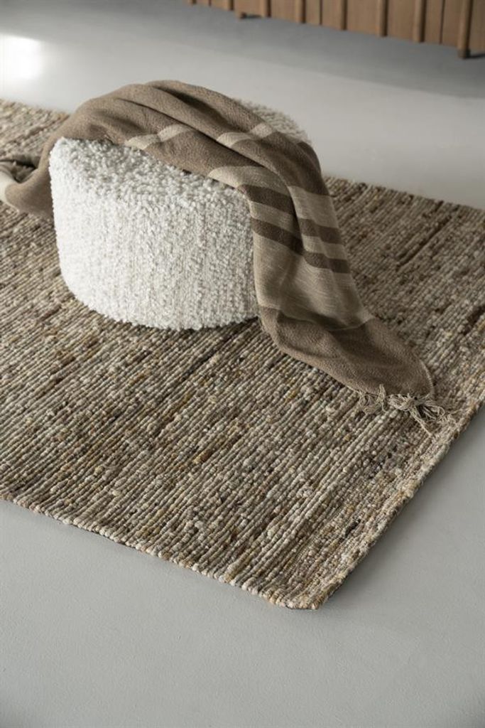 Elegant brun matta med naturlig känsla i 90% ull och 10% polyester, perfekt för att skapa värme och stil i ditt hem.