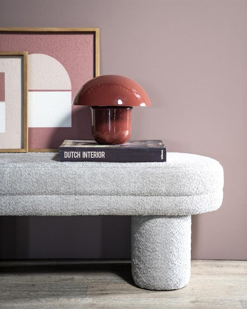 Den släta, glansiga ytan ger en modern touch, medan den unika svampformen bidrar till en lekfull men ändå sofistikerad estetik. Perfekt för att skapa en varm atmosfär i vilket rum som helst, kan denna lampa stå som en elegant inredningsdetalj på ett sidobord, en hylla eller en bokstapel.