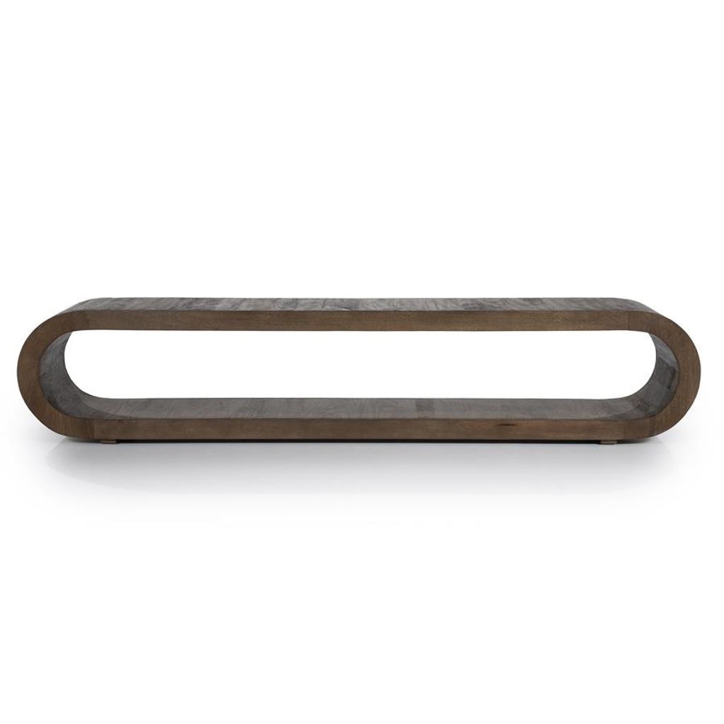 Elegant TV-bänk i mangoträ med rundade hörn och stilren design. Perfekt för modern inredning.