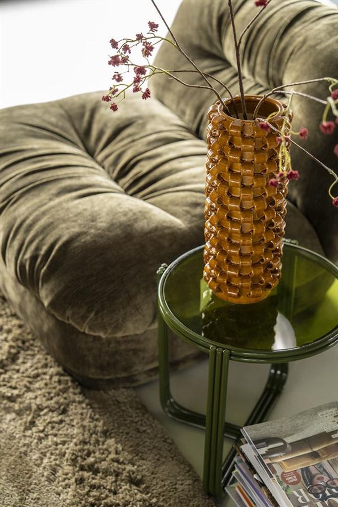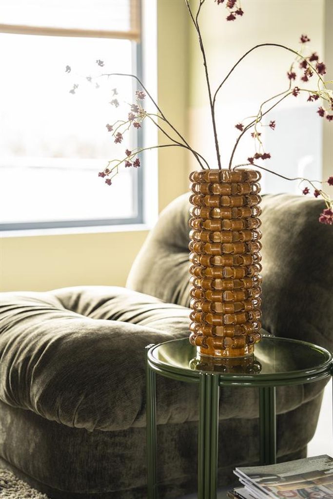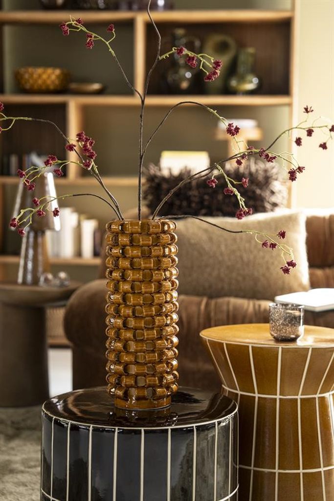 Den djärva, senapsgula färgen tillför ett livfullt inslag till din inredning och är perfekt för att bryta av i mer neutrala miljöer. Med måtten 15,7 x 15,7 x 39,5 cm är den idealisk för att placeras på ett soffbord, en hylla eller en fönsterbräda. Vasen passar utmärkt för att visa upp kvistar, torkade blommor eller bara som en iögonfallande dekoration i sig själv.