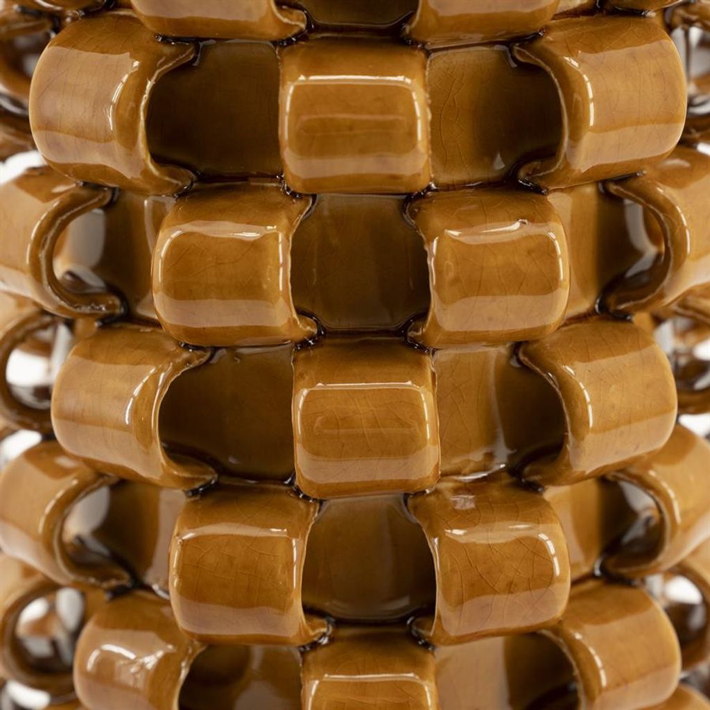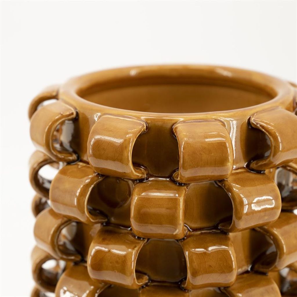 By Boo Vas Loopa 1 - Mustard Gul är en ikonisk vas som kombinerar modern design med traditionellt hantverk. Tillverkad av högkvalitativt glaserat lergods, denna handgjorda vas har en unik struktur med en rad av sammankopplade, fyrkantiga former som skapar ett intressant och dynamiskt utseende.