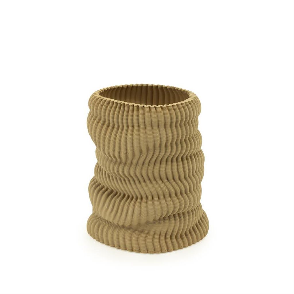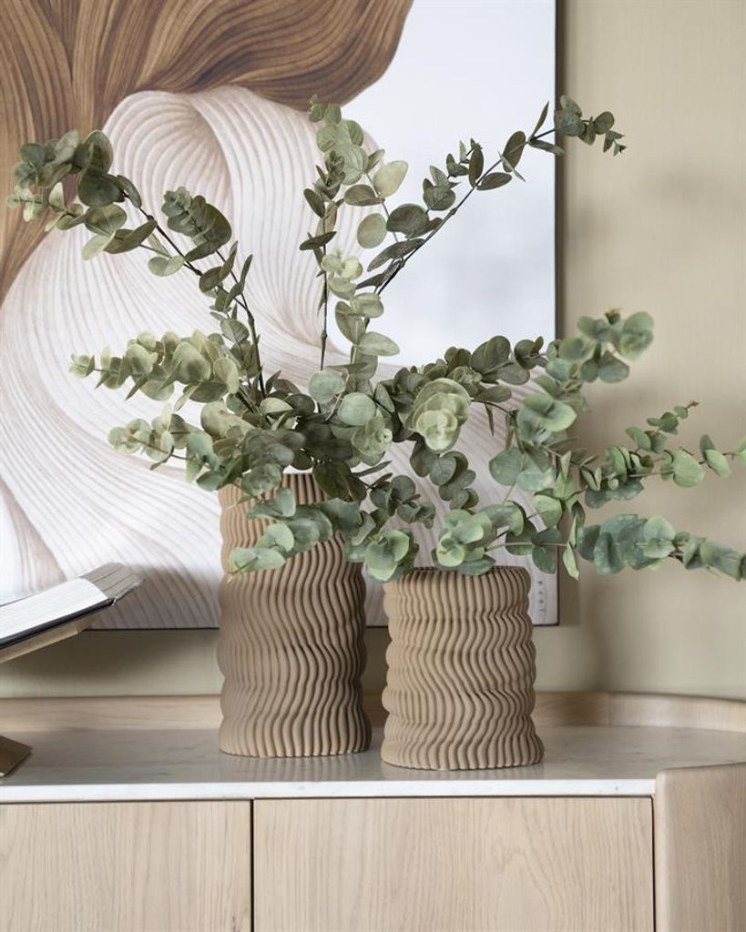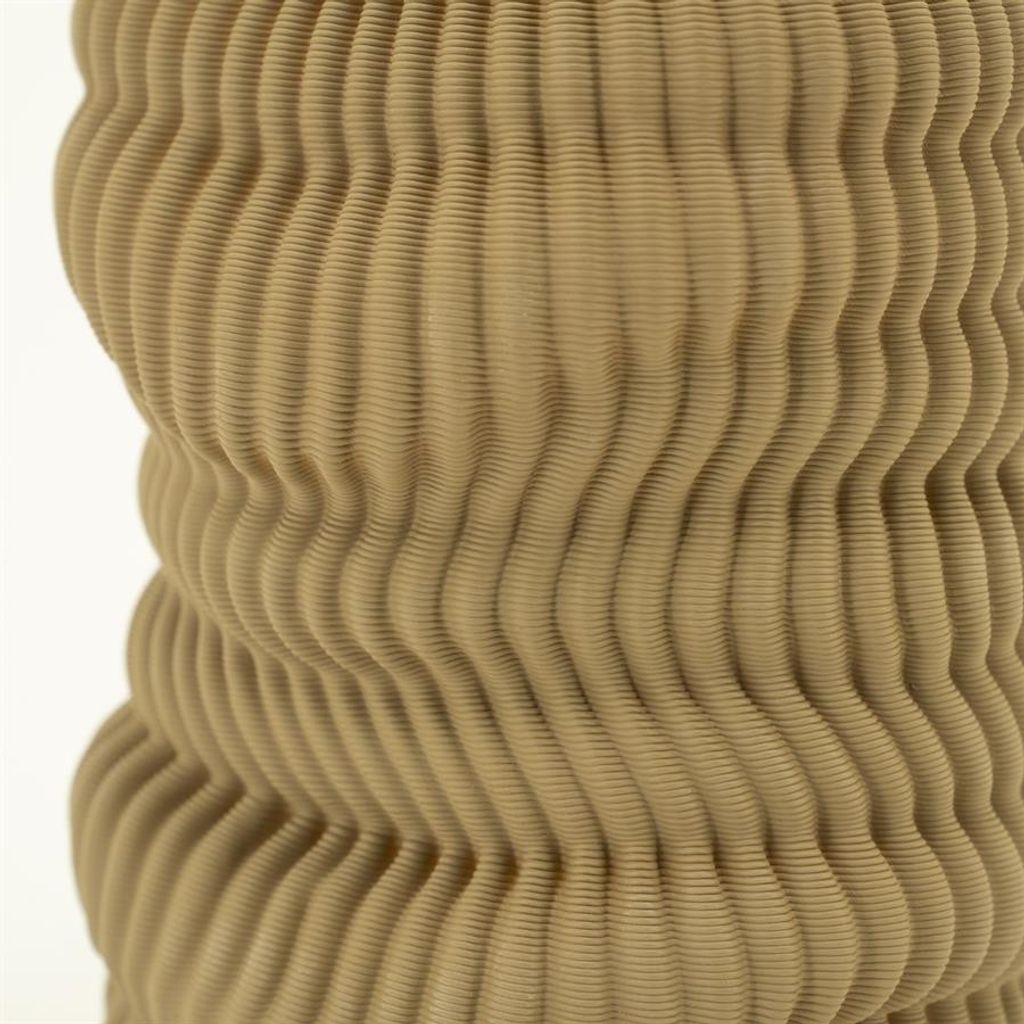 Elegant beige vas i keramik med unik vågig textur och modern design. Perfekt för att förhöja inredningen i ditt hem.