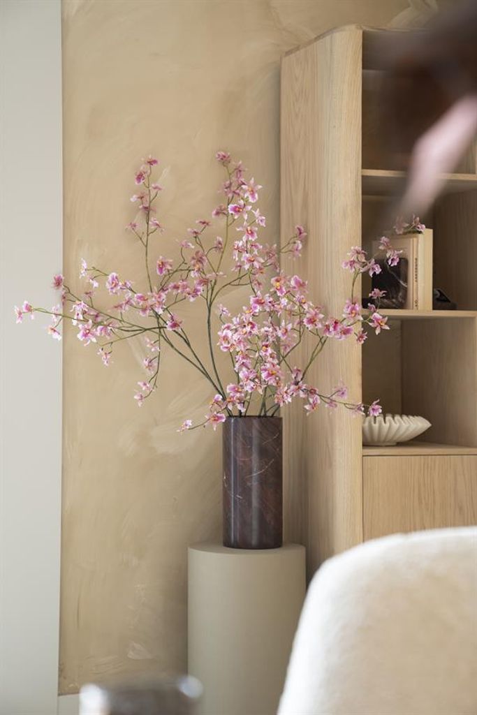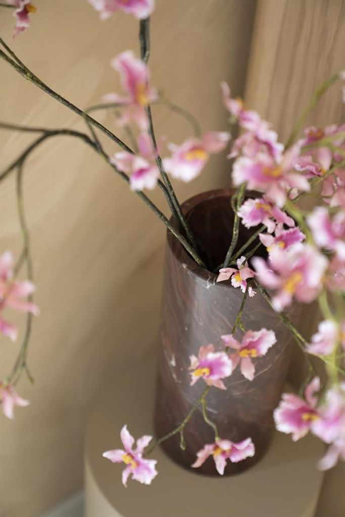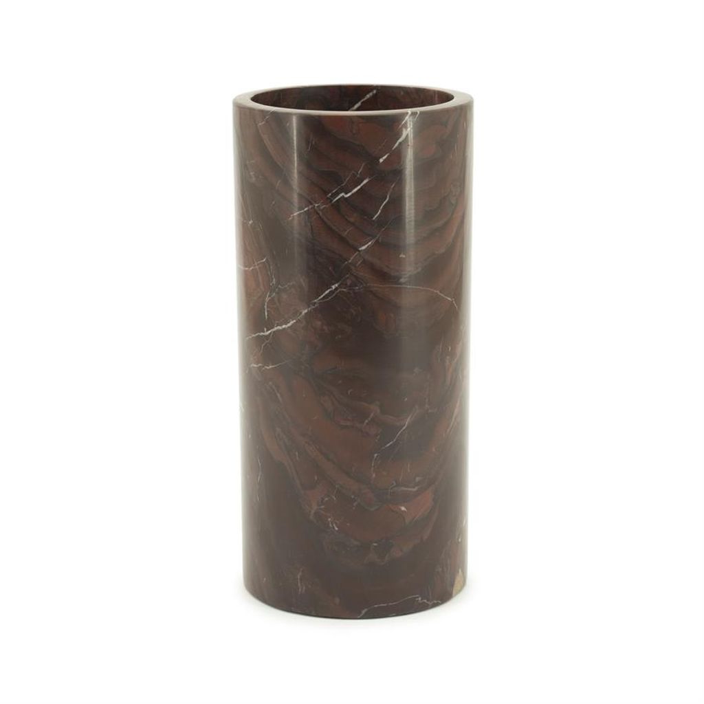 Elegant vas i röd marmor med unik ådring, perfekt för att lyfta din inredning.