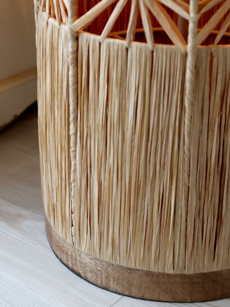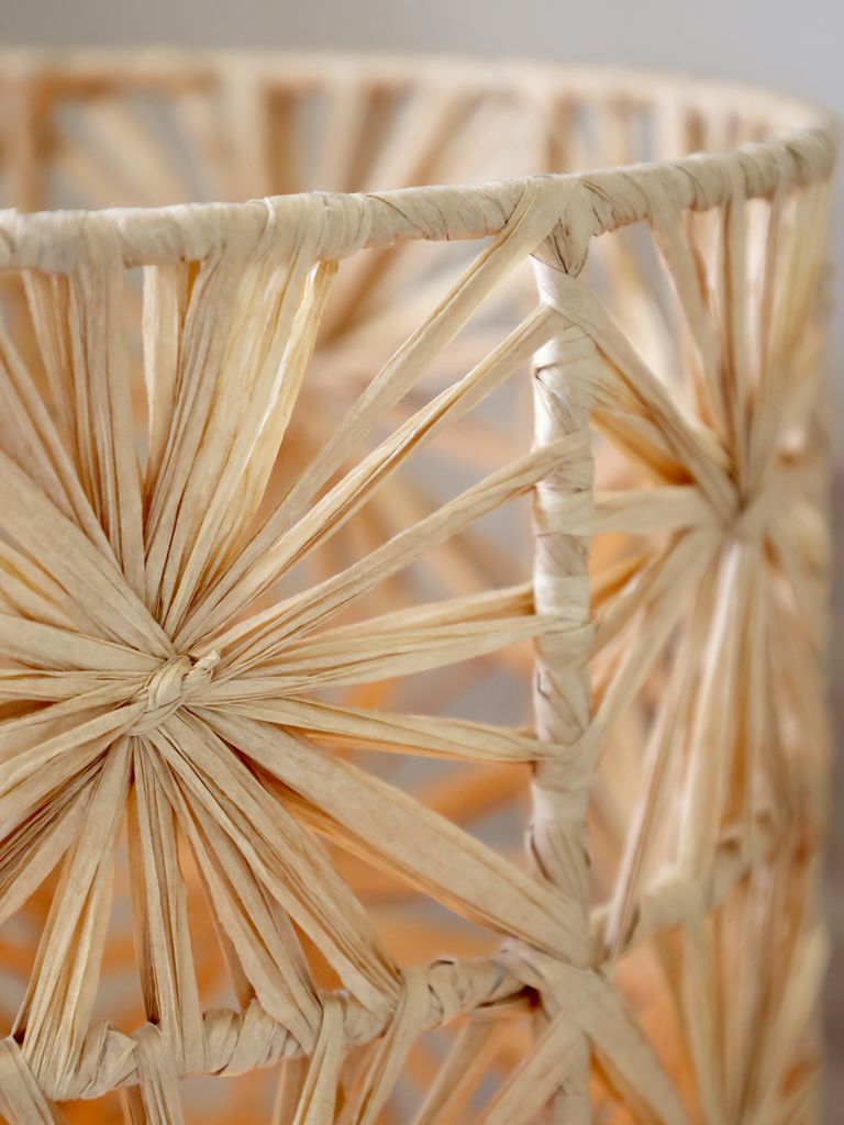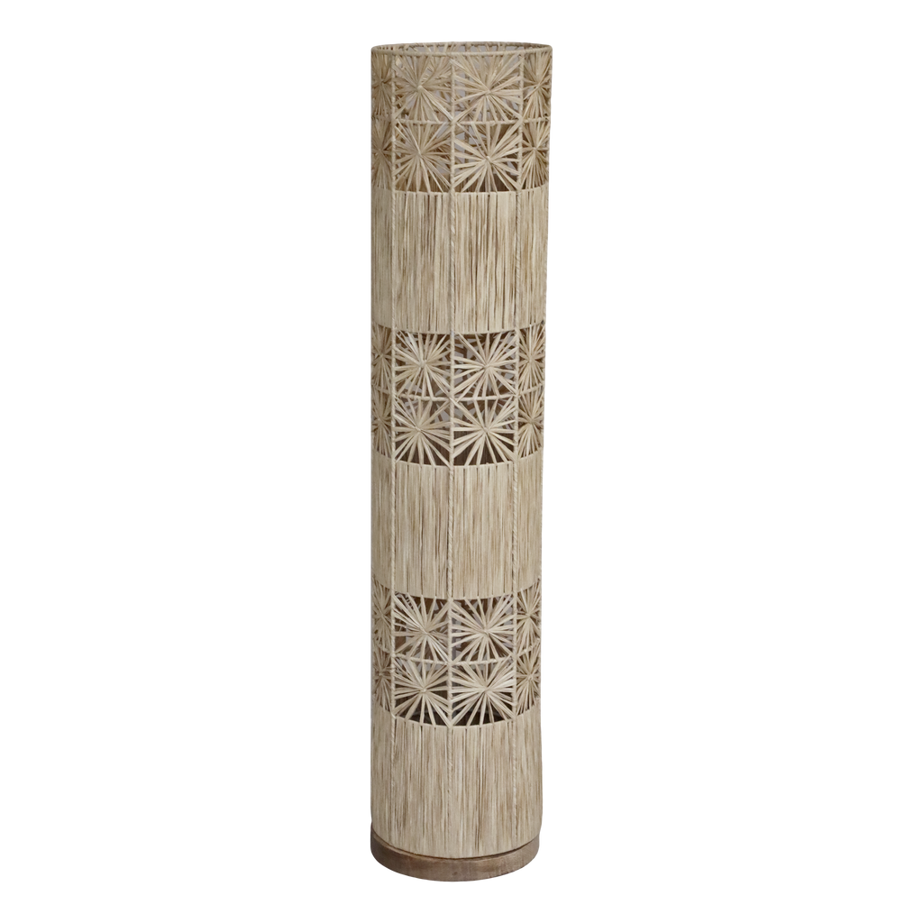 Lampans höjd på 127 cm och diametern på 28 cm gör den perfekt för både små och stora rum. Den naturliga färgen på raffia-materialet ger en mjuk och neutral framtoning som passar utmärkt i olika inredningsstilar. De intrikata mönstren i flätningen skapar vackra ljus- och skuggeffekter när lampan är tänd.