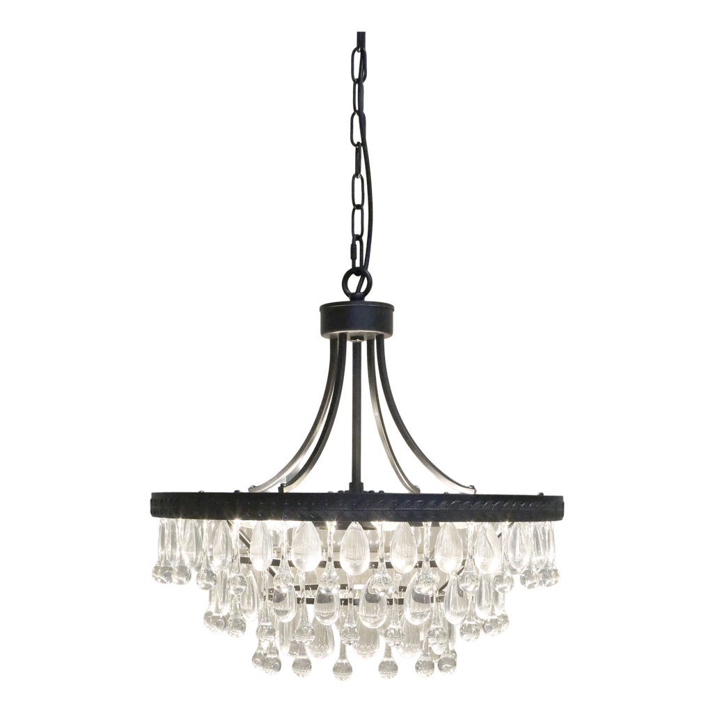 Förgyll ditt hem med denna eleganta ljuskrona i svart järn och glas. Perfekt för att skapa en lyxig atmosfär.