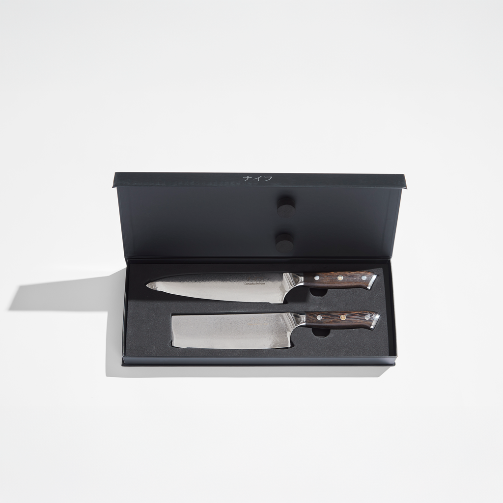 Set med kockkniv och grönsakskniv i damaskusstål, perfekt för både kött och grönsaker. En kombination av styrka och elegans.