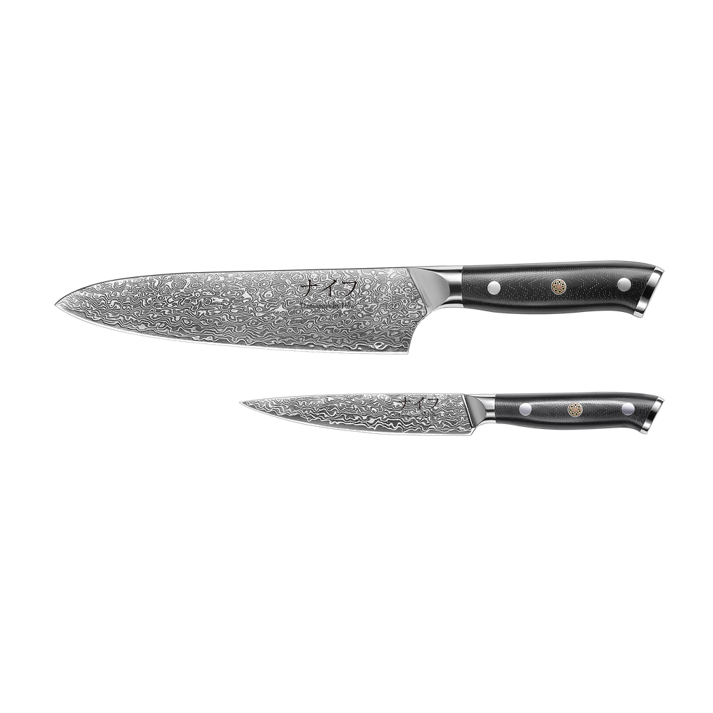 Knivarnas blad har en vacker mönstring tack vare damaskusstålet, vilket inte bara ger stil utan också styrka. Handtagen är tillverkade av svart G10-material, känt för sin hållbarhet och komfort, vilket ger ett säkert och ergonomiskt grepp under användning.