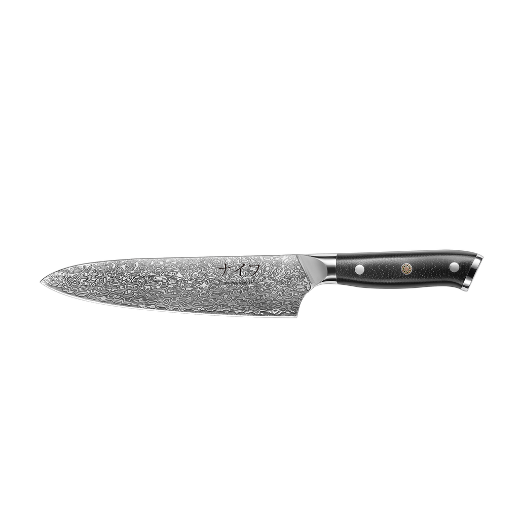 Kockkniv med 33,5 cm blad i 67 lager damaskusstål, perfekt för precisionsarbete i köket.