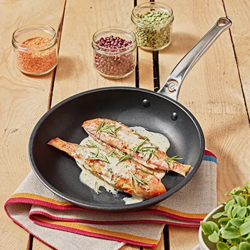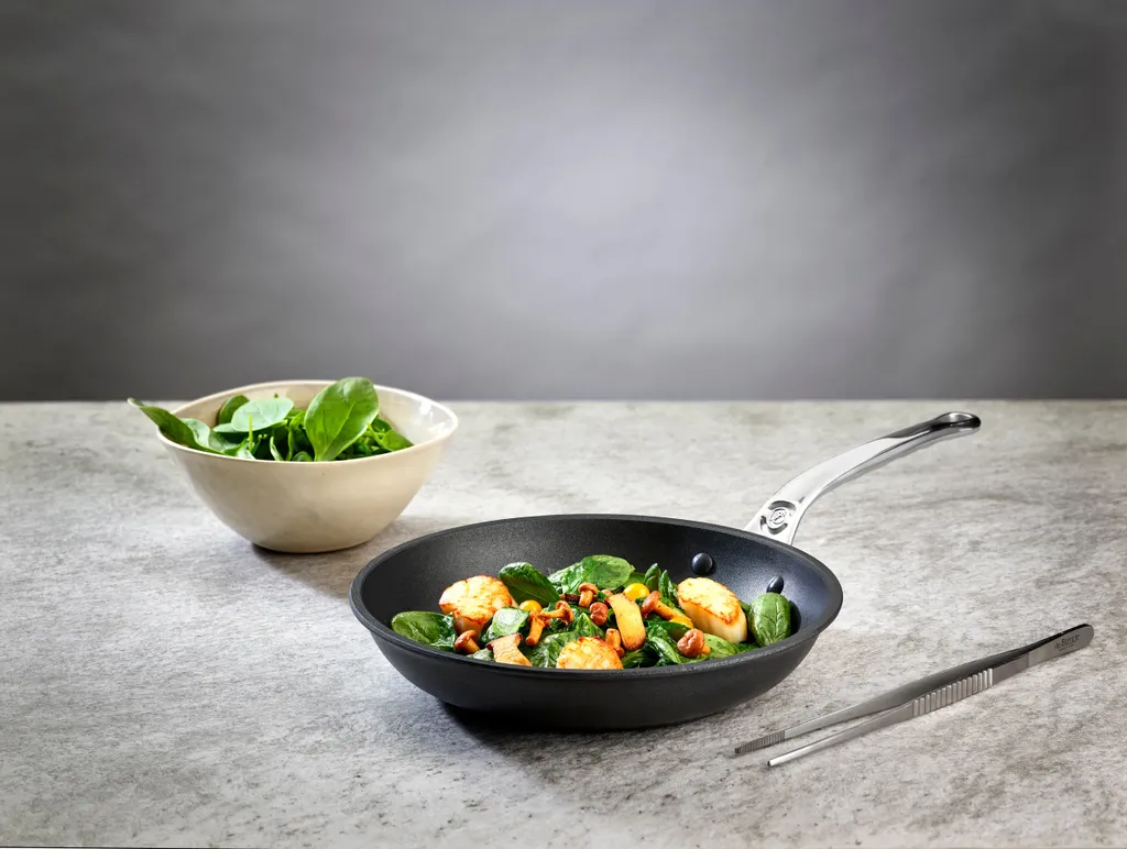 Choc Extreme stekpanna från franska de Buyer är en pålitlig panna med slitstark nonstickbeläggning som gör matlagningen både enkel och precis. Handtaget är stabilt och greppvänligt vilket ger bra kontroll även vid höga temperaturer. Pannan fördelar värmen jämnt och är perfekt för delikata råvaror som kräver noggrann tillagning. För bästa resultat rekommenderas långsam uppvärmning vilket både bevarar beläggningen och ger en jämnare stekyta.