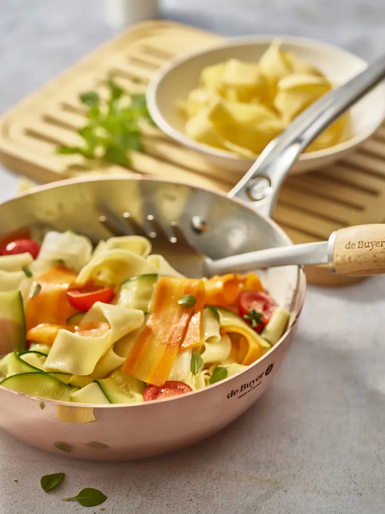 De Buyer Prima Matera Conical sautépanna 20 cm är en mångsidig kastrull i fransk design som kombinerar elegans med professionell prestanda. Den koniska formen gör den idealisk för att tillaga grönsaker, reducera såser och laga mustiga grytor med precision. Tack vare den snabba och jämna värmefördelningen blir matlagningen både enkel och effektiv. Handtaget är praktiskt utformat och greppvänligt för stabil och bekväm användning. Den silverfärgade ytan gör att sautépannan är lika vacker att ställa fram direkt på bordet som den är funktionell i köket. Passar för induktion, gas och glaskeramik.